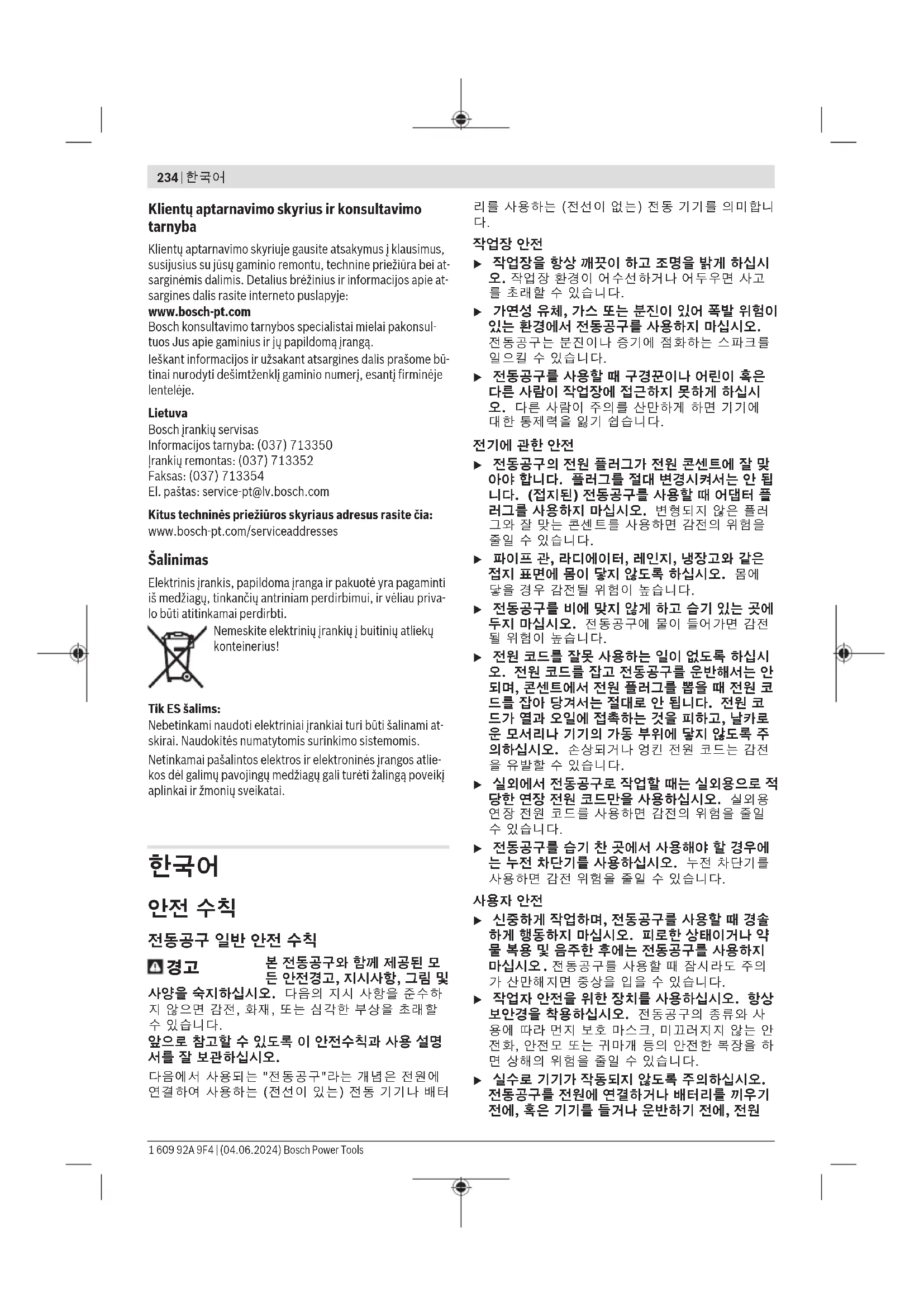 기기와 액세서리 및 포장 등은 환경 친화적인 방법 으로 재생할 수 있도록 분류하십시오. 1 609 92A 9F4 | (04.06.2024) Bosch Power Tools한국어 | 241 전동공구를 가정용 쓰레기로 처리하지