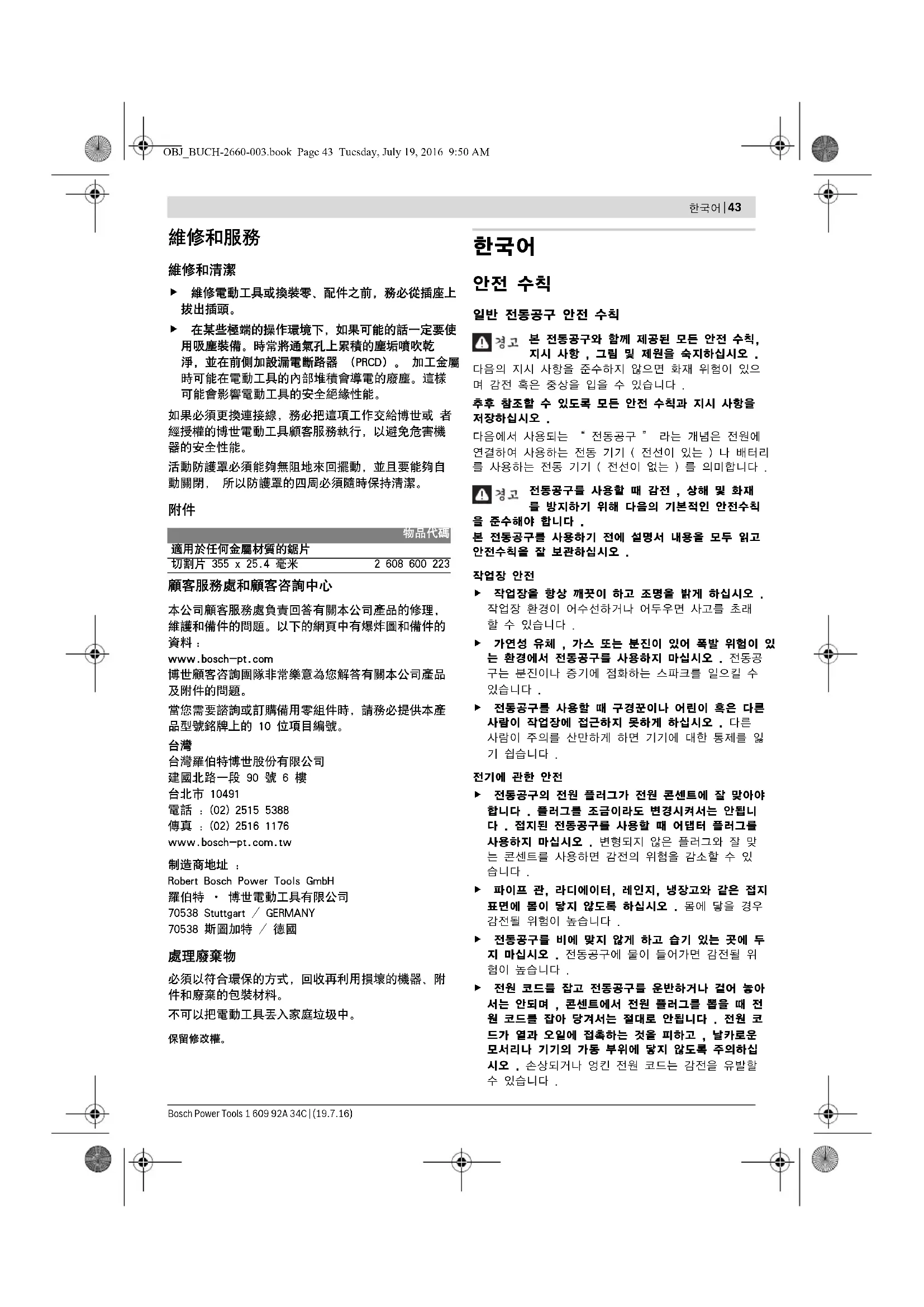 適用於任何金屬材質的鋸片 切割片 355 x 25.4 毫米 2 608 600 223 OBJ_BUCH-2660-003.book Page 43 Tuesday, July 19, 2016 9:50 AM44 | 한국어 1 609 92A 34C | (19.7.16) Bosch Power Tools 실외에서 전동공구로 작업할 때는 실외용으로 적당 한 연장 전원 코드만을 사용하십시오 . 실외용 연장 전원 코드를 사용하면 감전의 위험을 줄일 수 있습