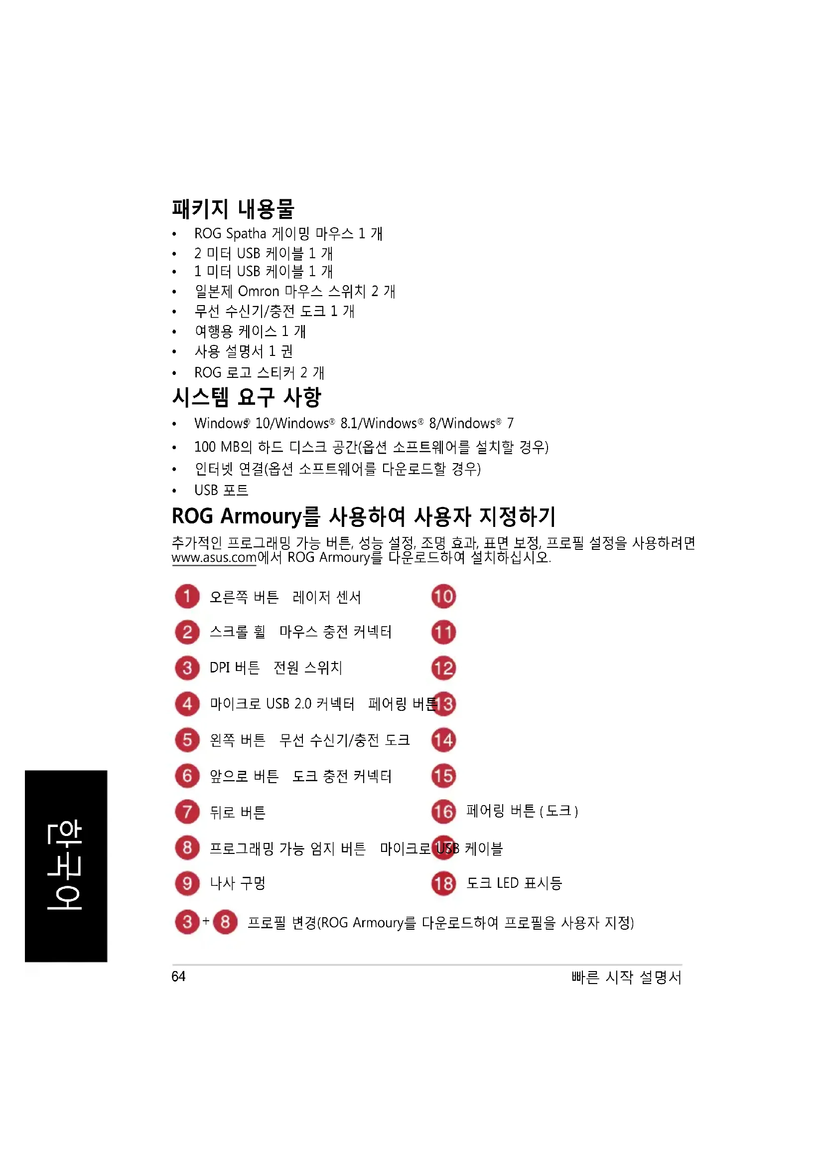 기기 설명서 다운로드 마우스 무료 PDF 형식! 매뉴얼 찾기 ROG Spatha - ASUS 전자 기기를 다시 손에 넣으세요. 이 페이지에는 기기 사용에 필요한 모든 문서가 게시되어 있습니다. ROG Spatha 브랜드 ASUS.