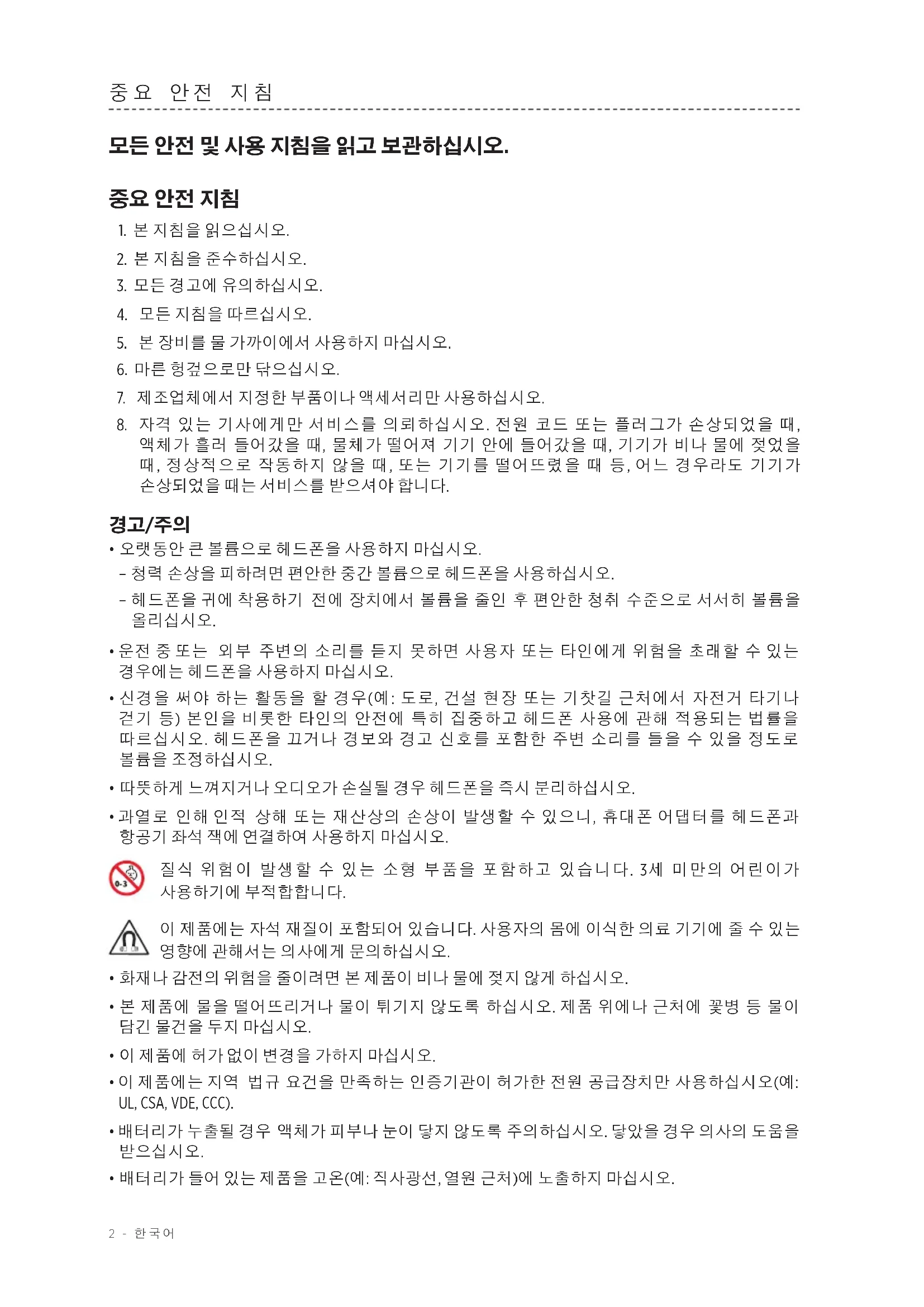 | 안전 | 청력 손상을 방지하기 위해 적절한 볼륨으로 사용하고, 물이나 극한 온도에 노출하지 마십시오. |