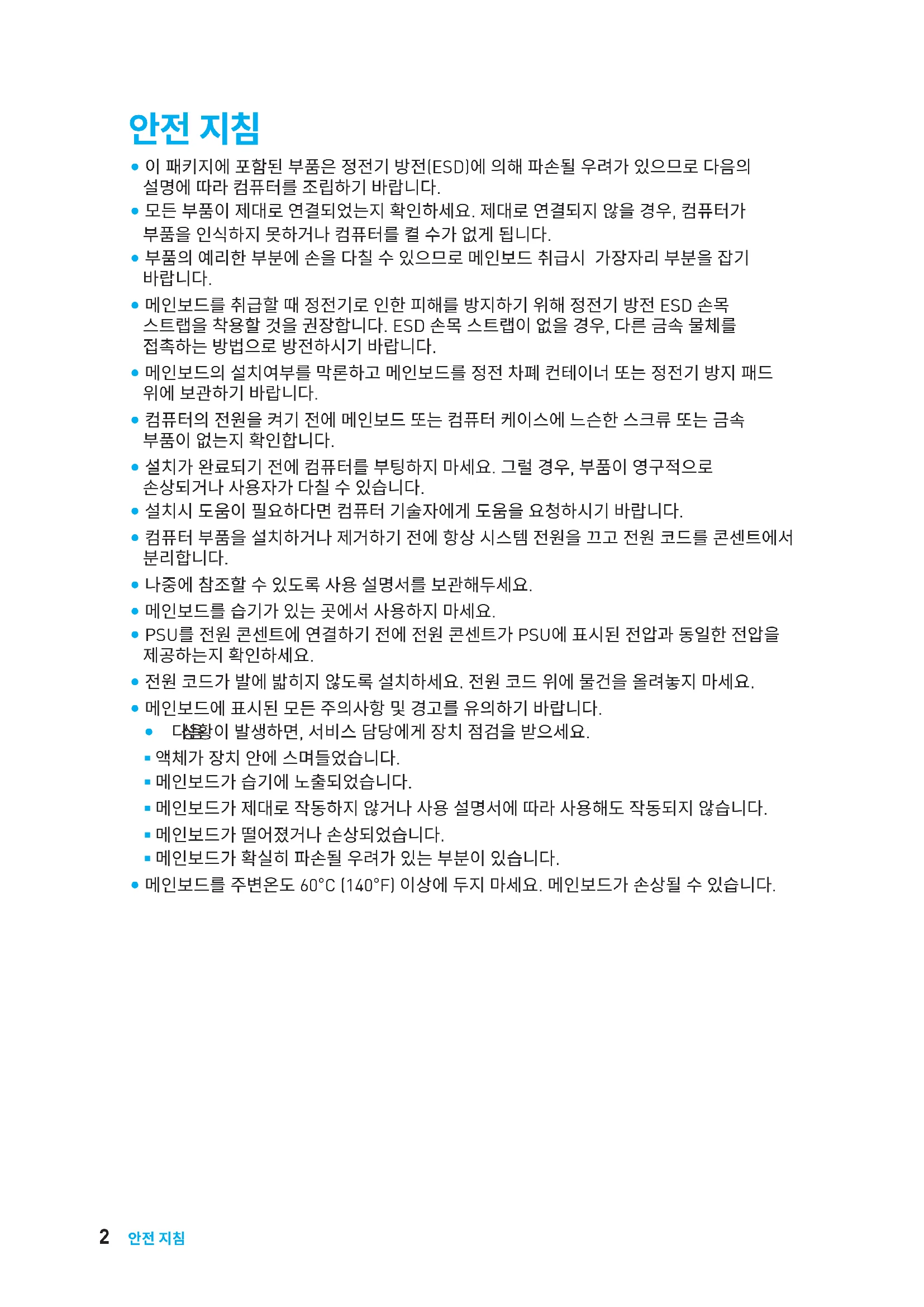 y 나중에 참조할 수 있도록 사용 설명서를 보관해두세요. y 메인보드를 습기가 있는 곳에서 사용하지 마세요. y PSU를 전원 콘센트에 연결하기 전에 전원 콘센트가 PSU에 표시된 전압과 동일한 전압을 제공하는지 확인하세요. y 전원 코드가 발에 밟히지 않도록 설치하세요. 전원 코드 위에 물건을 올려놓지 마세요. y 메인보드에 표시된 모든 주의사항 및 경고를 유의하기 바랍니다. y 다음 상황이 발생하면, 서비스 담당에게 장치 점검을 받으세요. 액체가 장치 안에 스며들었습니다. 메인보드가 습기에 노출되었습니다. 메인보드가 제대로 작동하지 않거나 사용 설명서에 따라 사용해도 작동되지 않습니다. 메인보드가 떨어졌거나 손상되었습니다. 메인보드가 확실히 파손될 우려가 있는 부분이 있습니다. y 메인보드를 주변온도 60°C (140°F) 이상에 두지 마세요. 메인보드가 손상될 수 있습니다.3