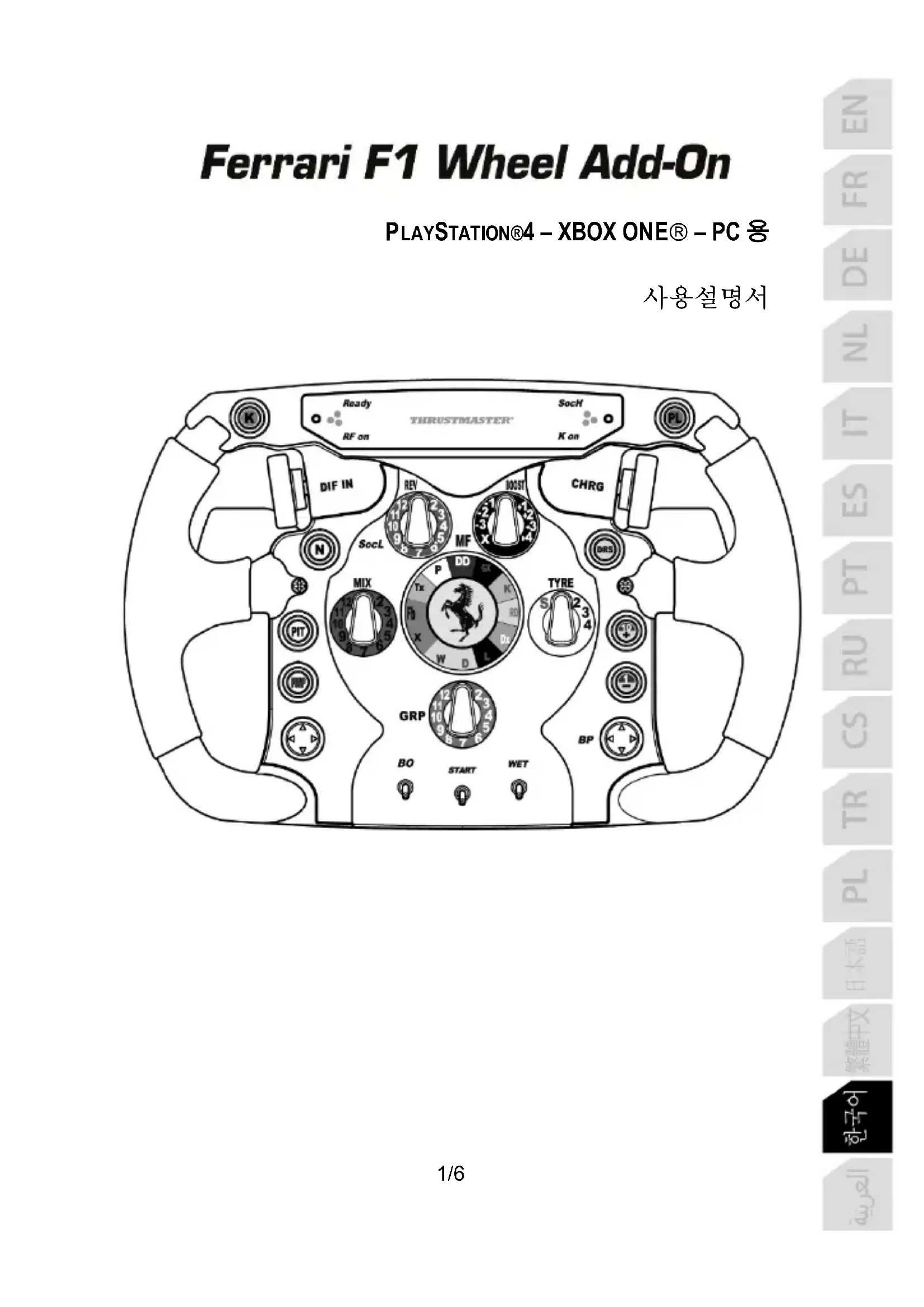 Ferrari F1 Wheel Add-On 핸들이 레이싱 핸들 베이스 (특히 TX, T300 및 T500 베이스)와 제대로 작동하기 위해서는 베이스 펌웨어를 최신 버전으로 반드시 업데이트해야 합니다. 베이스 펌웨어는 https://support.thrustmaster.com에서 다운로드하실 수 있습니다 (레이싱 핸들 / [베이스명] / 펌웨어를 클릭한 후, 지침과 다운로드 및 설치 절차를 따르세요). 펌웨어를 업데이트하지 않는 경우, 핸들의 D 패드, 버튼 및 패들 시프터가 제대로 기능하지 않습니다.4/6 PC 매핑5/6 PLAYSTATION®4 매핑