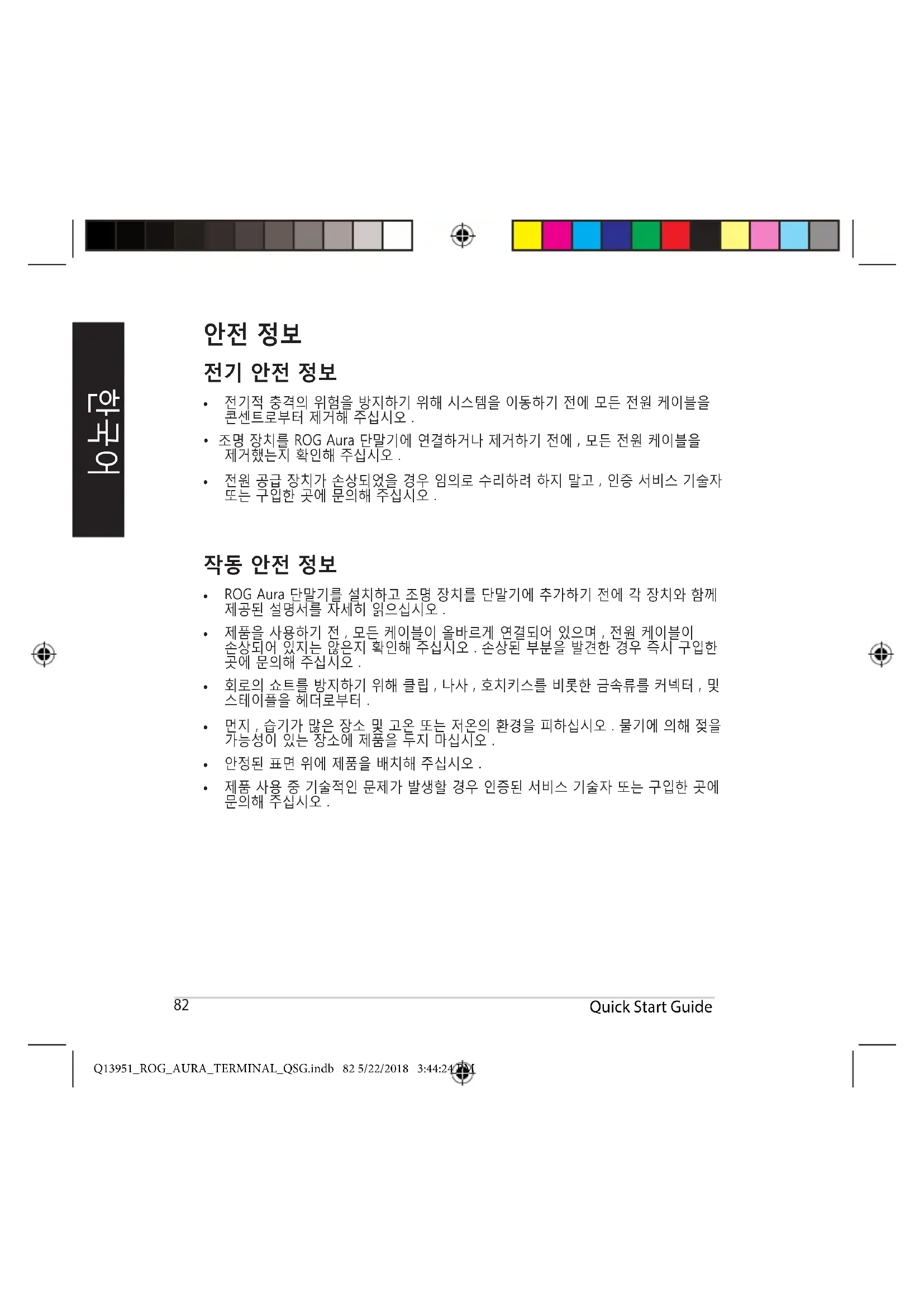 經型式認證合格之低功率射頻電機,非經許可,公司、商號或使用者均不得擅自變更頻率、加大功率或變更 原設計之特性及功能。低功率射頻電機之使用不得影響飛航安全及干擾合法通信;經發現有干擾現象時,應 立即停用,並改善至無干擾時方得繼續使用。前項合法通信,指依電信法規定作業之無線電通信。低功率射 頻電機須忍受合法通信或工業、科學及醫療用電波輻射性電機設備之干擾。 KC: Korea Warning Statement B급 기기 (가정용 방송통신기자제) 이 기기는 가정용(B급) 전자파적합기기로서 주로 가정에서 사용하는 것을 목적으로하며, 모든 지역에서 사용할 수 있습니다 *당해 무선설비는 전파흔신 가능성이 있으므로 인명안전과 관련된 서비스는 할 수 없습니다 대한민국 규정 및 준수 방통 위고시에 따른 고지사항 해당 무선설비는 운용 중 전파흔신 가능성이 있음 이 기기는 인명안전과 관련된 서비스에 사용할 수 없습니다 CE Mark Warning Simplied EU Declaration of Conformity ASUSTek Computer Inc. hereby declares that this device is in compliance with the essential requirements and otherrelevantprovisionsofDirective2014/53/EU.FulltextofEUdeclarationofconformityisavailableathttps:// www.asus.com/support/ Déclaration simpliée de conformité de l’UE ASUSTekComputerInc.déclareparlaprésentequecetappareilestconformeauxcritèresessentielsetautres clausespertinentesdeladirective2014/53/EU.Ladéclarationdeconformitédel’UEpeutêtretéléchargéeàpartir du site internet suivant : https://www.asus.com/support/ Q13951_ROG_AURA_TERMINAL_QSG.indb 106 5/22/2018 3:44:28 PMROG Aura Terminal