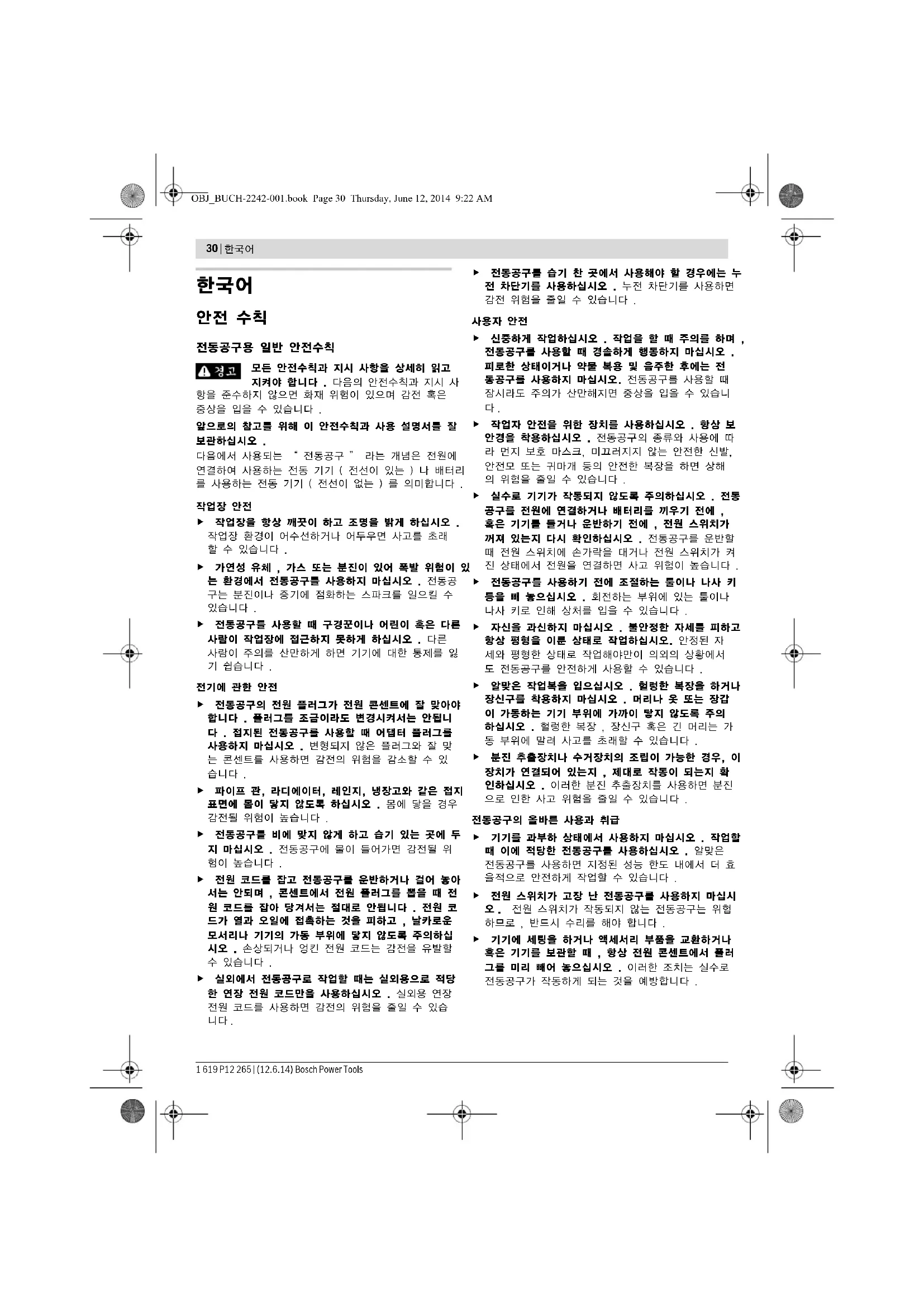 OBJ_BUCH-2242-001.book Page 31 Thursday, June 12, 2014 9:22 AM32 | 한국어 1 619 P12 265 | (12.6.14) Bosch Power Tools 전동공구를 가연성 물질 가까이에서 사용하지 마십 시오 . 스파크가 이 물질을 점화할 수 있습니다 . 액체 냉각제가 필요한 연마공구를 사용하지 마십시 오. 물이나 기타 액체 냉각제를 사용하면 감전될 수