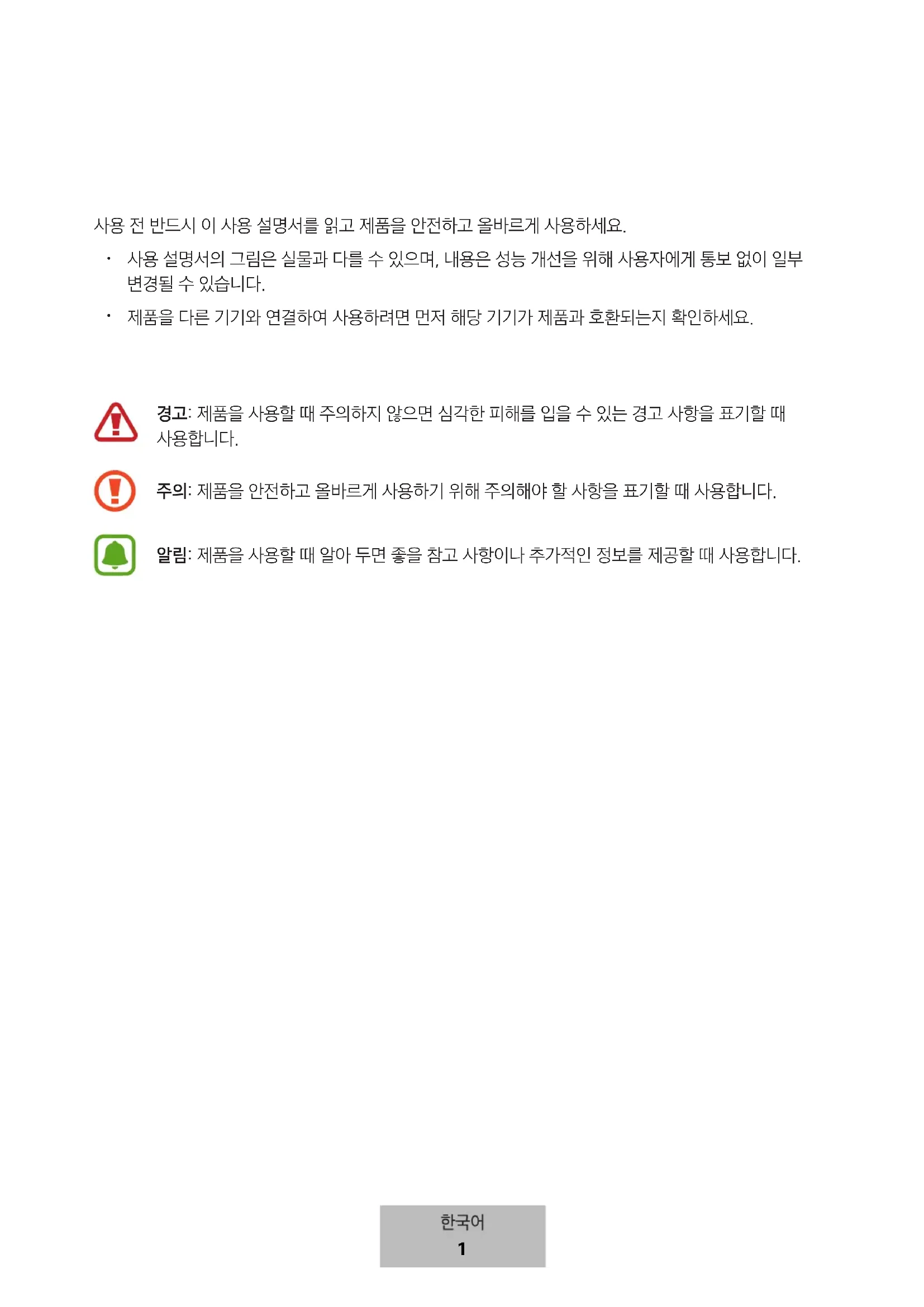 주의: 제품을 안전하고 올바르게 사용하기 위해 주의해야 할 사항을 표기할 때 사용합니다. 알림: 제품을 사용할 때 알아 두면 좋을 참고 사항이나 추가적인 정보를 제공할 때 사용합니다.