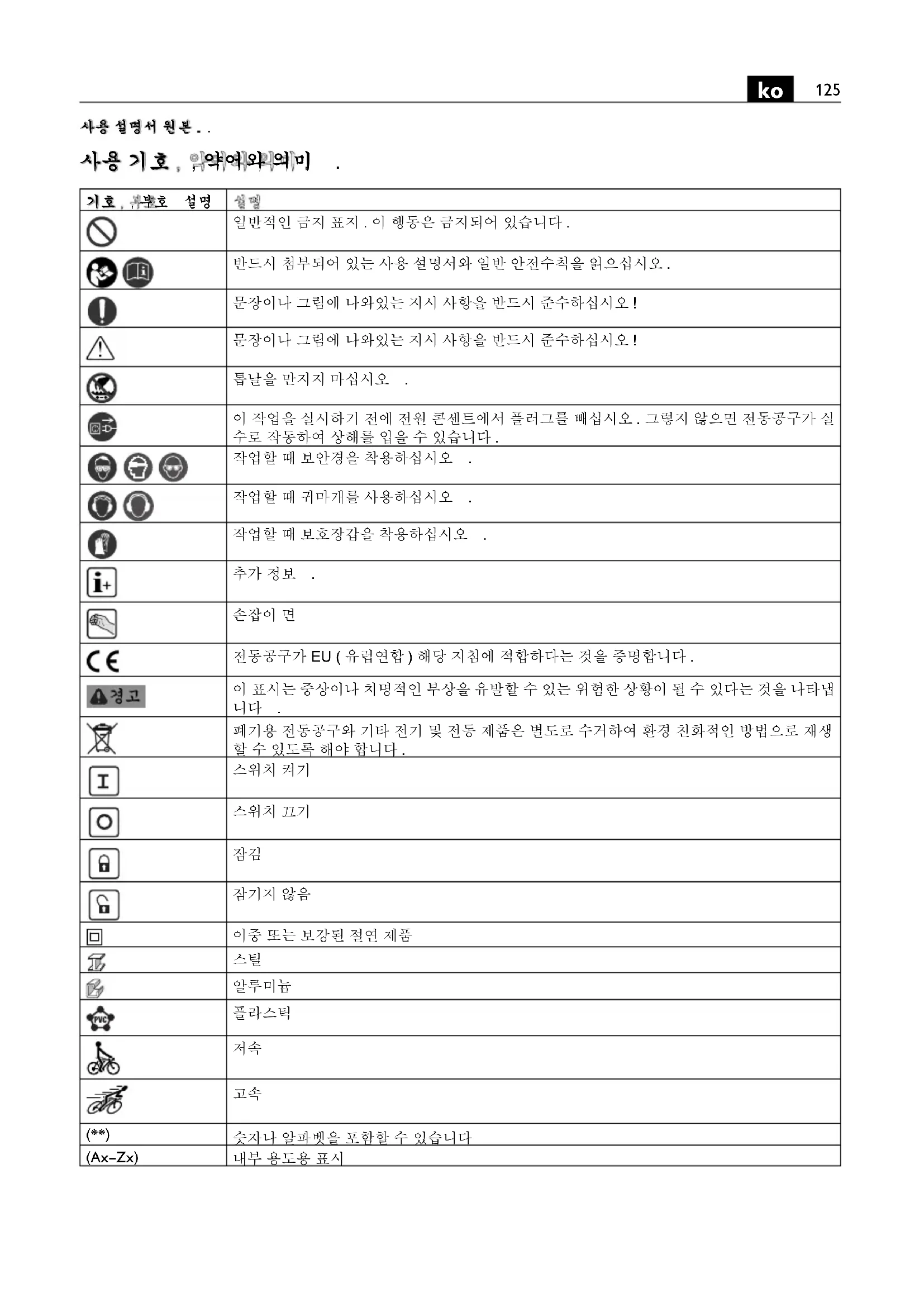 사용 설명서 원본 . 사용 기호 , 약어와 의미 .