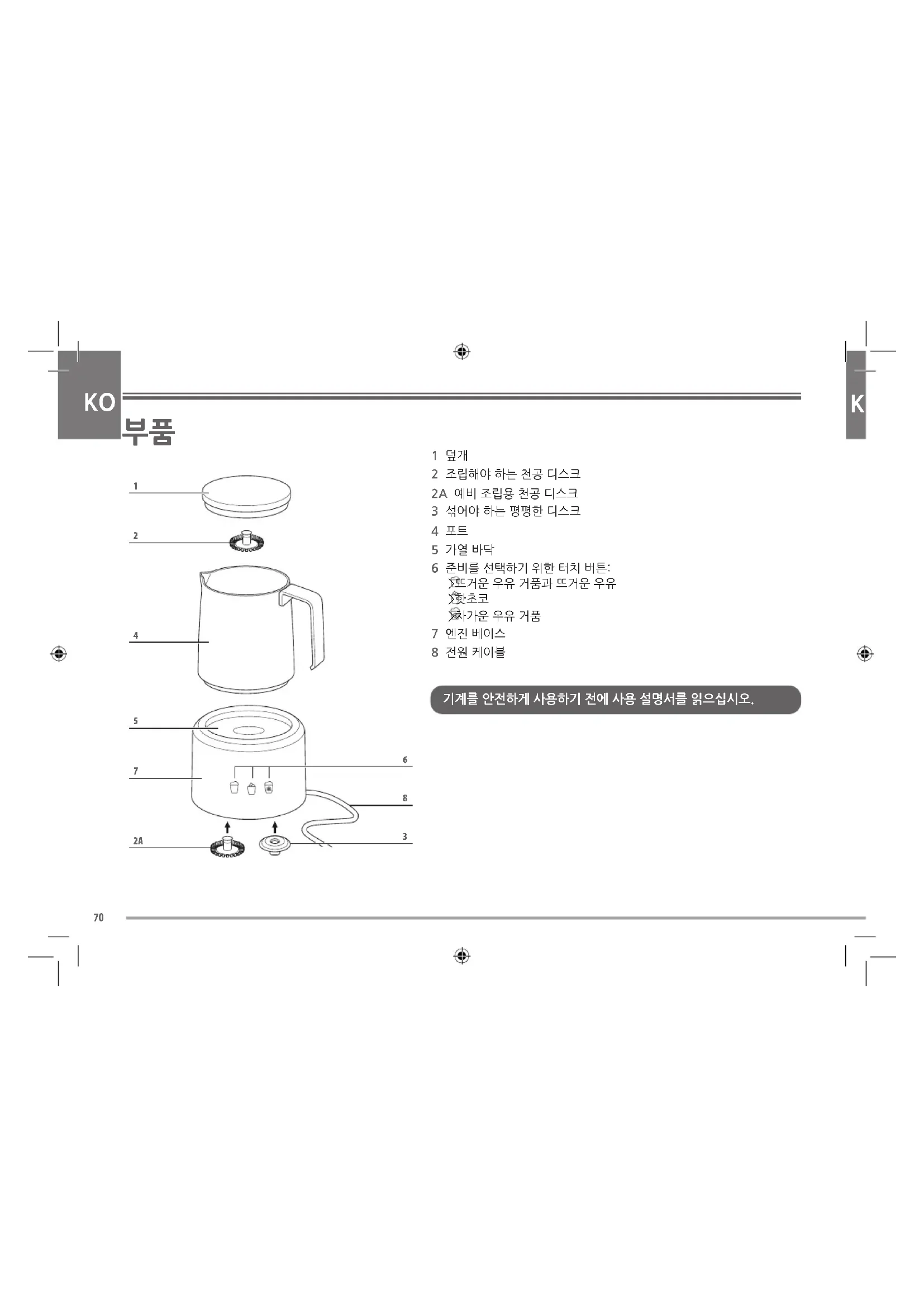 1 덮개 2 조립해야 하는 천공 디스크 2A 예비 조립용 천공 디스크 3 섞어야 하는 평평한 디스크 4 포트 5 가열 바닥 6 준비를 선택하기 위한 터치 버튼: >뜨거운 우유 거품과 뜨거운 우유