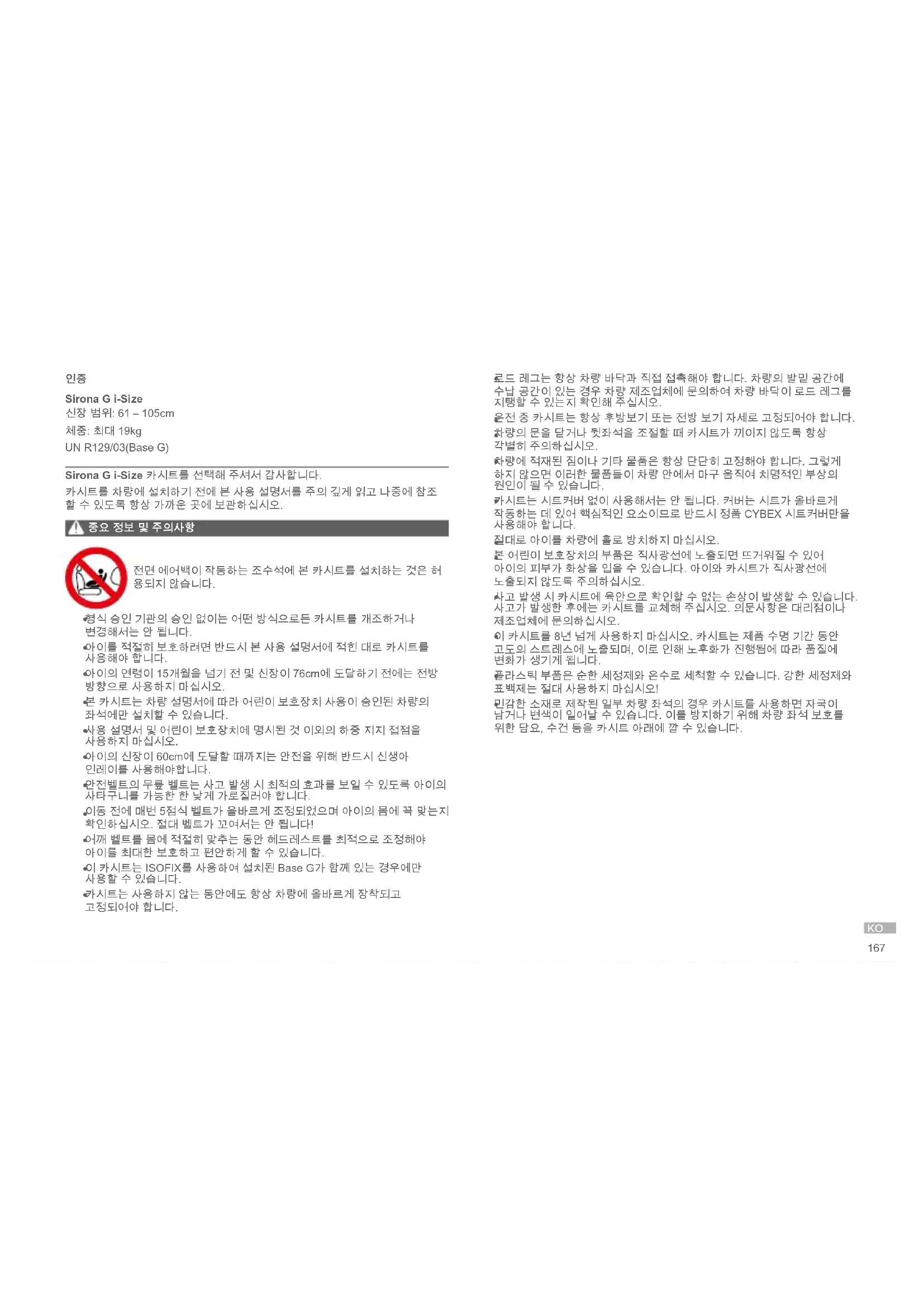 Sirona G i-Size 신장 범위: 61 – 105cm 체중: 최대 19kg UN R129/03(Base G) Sirona G i-Size 카시트를 선택해 주셔서 감사합니다. 카시트를 차량에 설치하기 전에 본 사용 설명서를 주의 깊게 읽고 나중에 참조 할 수 있도록 항상 가까운 곳에 보관하십시오. 중요 정보 및 주의사항 전면 에어백이 작동하는 조수석에 본 카시트를 설치하는 것은 허