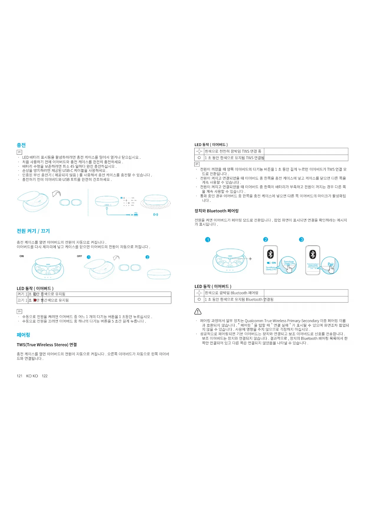 LED 동작 ( 이어버드 ) 흰색으로 천천히 깜박임 TWS연결 중 1 초 동안 흰색으로 유지됨 TWS연결됨