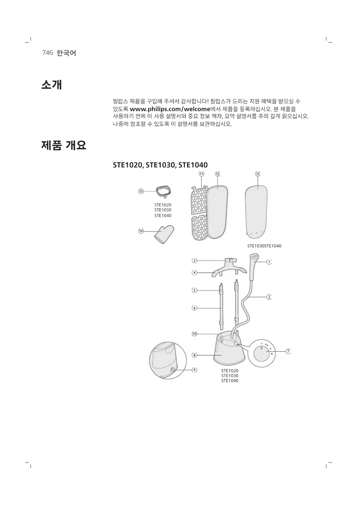 1 스티머 헤드 2 스팀호스 3 스팀머 도크 4 옷걸이(STE1011, STE1020, STE1030, STE1040) 5 폴 잠금 클립 6 폴 7 스팀량 조절기 8 베이스 9 석회질 제거 조절기 10 물 탱크748