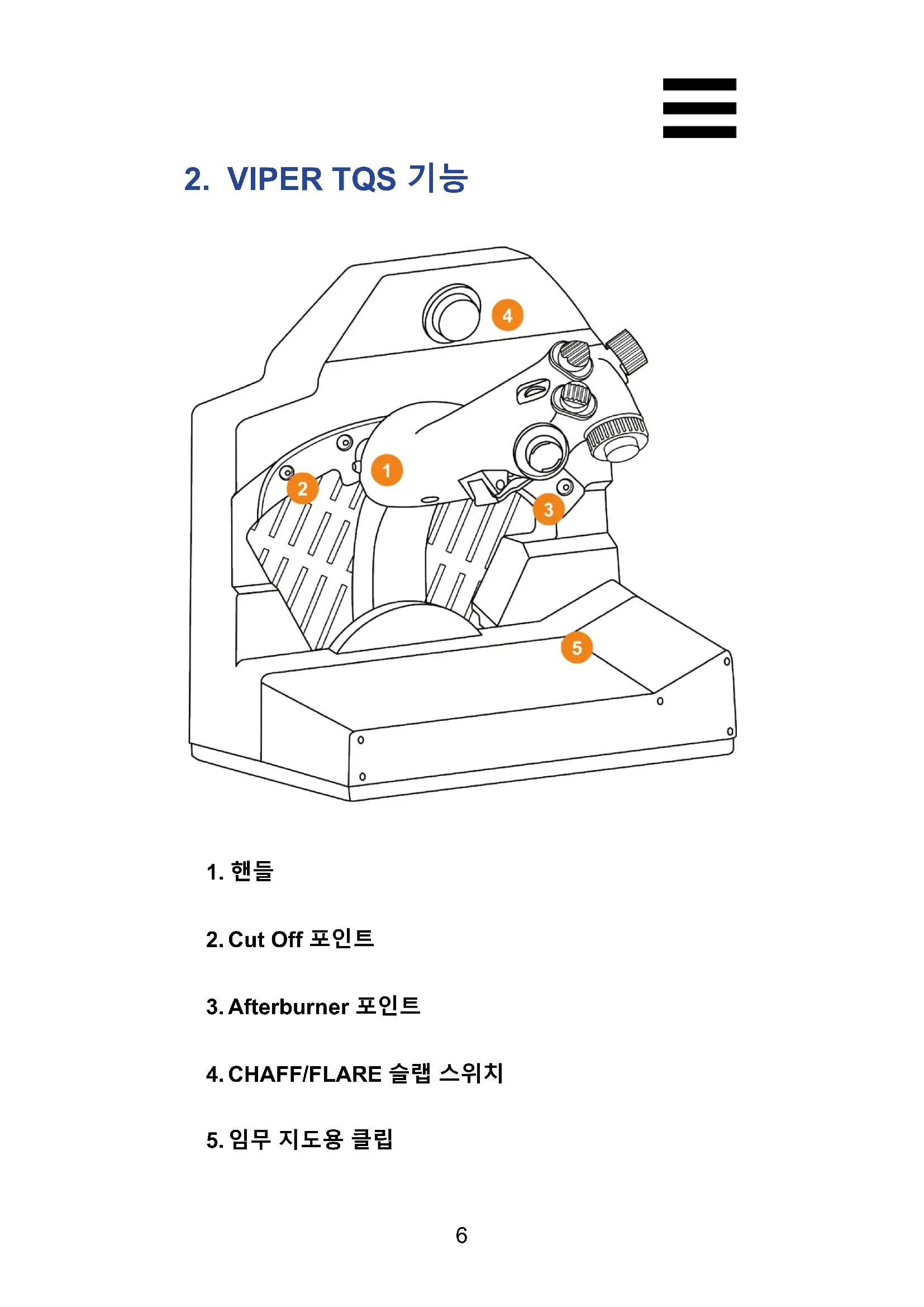 위해서는 펌웨어를 업데이트해야 합니다. 업데이트를 실행하려면 다음 사이트를 방문하십시오. https://support.thrustmaster.com/product/viper-tqs/ Firmware(펌웨어)를 선택한 후, 다운로드 및 설치