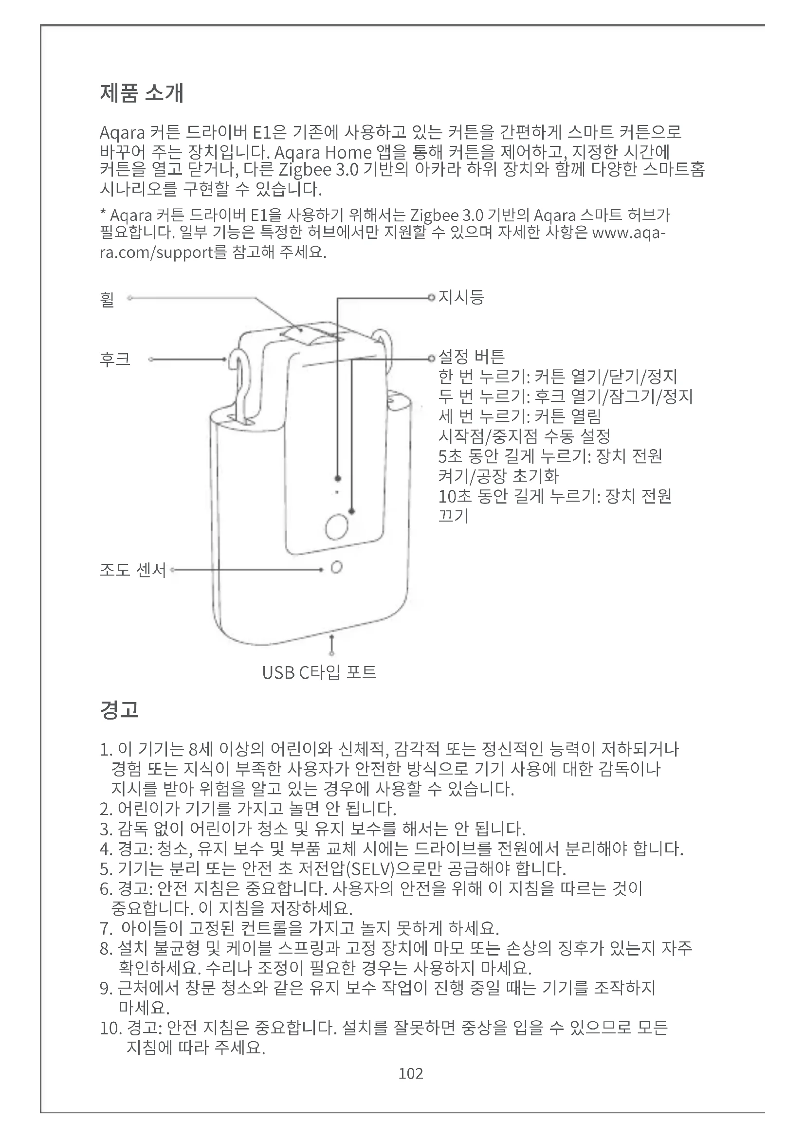 - Aqara 커튼드라이버 E1을사용하기위해서는 Zigbee 3.0 기반의 Aqara 스마트허브가 필요합니다. 일부기능은특정한허브에서만지원할수있으며자세한사항은 www.aqa- ra.com/support를참고해주세요. Aqara 커튼드라이버 E1은기존에사용하고있는커튼을간편하게스마트커튼으로 바꾸어주는장치입니다. Aqara Home 앱을통해커튼을제어하고, 지정한시간에 커튼을열고닫거나, 다른 Zigbee 3.0 기반의아카라하위장치와함께다양한스마트홈 시나리오를구현할수있습니다.