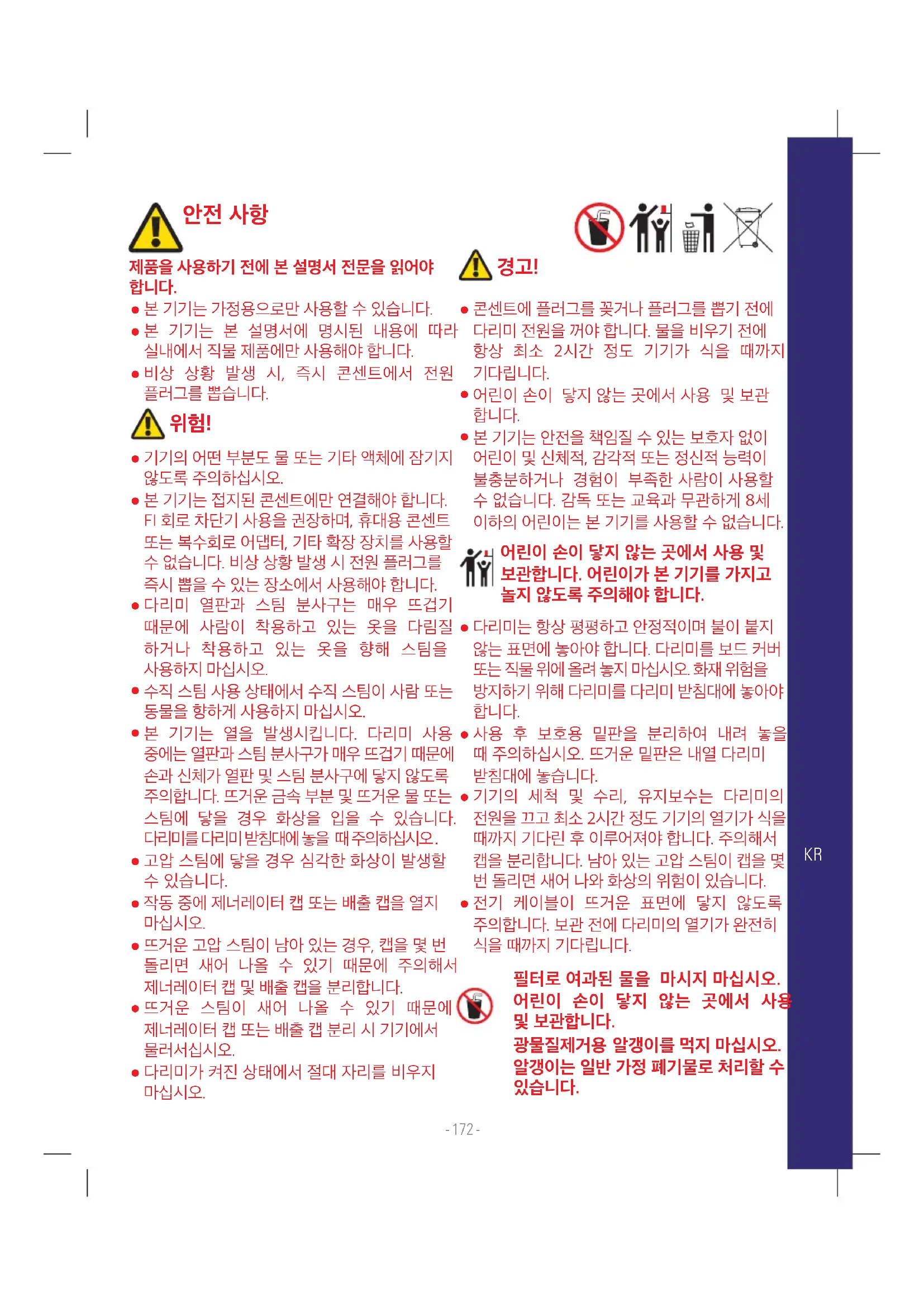 본 기기는 가정용으로만 사용할 수 있습니다. 본 기기는 본 설명서에 명시된 내용에 따라실내에서 직물 제품에만 사용해야 합니다. 비상 상황 발생 시, 즉시 콘센트에서 전원플러그를 뽑습니다. 기기의 어떤 부분도 물 또는 기타 액체에 잠기지않도록 주의하십시오. 본 기기는 접지된 콘센트에만 연결해야 합니다.FI 회로 차단기 사용을 권장하며, 휴대용 콘센트또는 복수회로 어댑터, 기타 확장 장치를 사용할수 없습니다. 비상 상황 발생 시 전원 플러그를즉시 뽑을 수 있는 장소에서 사용해야 합니다. 다리미 열판과 스팀 분사구는 매우 뜨겁기때문에 사람이 착용하고 있는 옷을 다림질하거나 착용하고 있는 옷을 향해 스팀을사용하지 마십시오. 수직 스팀 사용 상태에서 수직 스팀이 사람 또는동물을 향하게 사용하지 마십시오. 본 기기는 열을 발생시킵니다. 다리미 사용중에는 열판과 스팀 분사구가 매우 뜨겁기 때문에손과 신체가 열판 및 스팀 분사구에 닿지 않도록주의합니다. 뜨거운 금속 부분 및 뜨거운 물 또는스팀에 닿을 경우 화상을 입을 수 있습니다.다리미를 다리미 받침대에 놓을 때 주의하십시오 . 고압 스팀에 닿을 경우 심각한 화상이 발생할수 있습니다. 작동 중에 제너레이터 캡 또는 배출 캡을 열지마십시오. 뜨거운 고압 스팀이 남아 있는 경우, 캡을 몇 번돌리면 새어 나올 수 있기 때문에 주의해서제너레이터 캡 및 배출 캡을 분리합니다. 뜨거운 스팀이 새어 나올 수 있기 때문에제너레이터 캡 또는 배출 캡 분리 시 기기에서물러서십시오. 다리미가 켜진 상태에서 절대 자리를 비우지마십시오. 콘센트에 플러그를 꽂거나 플러그를 뽑기 전에 다리미 전원을 꺼야 합니다. 물을 비우기 전에항상 최소 2시간 정도 기기가 식을 때까지기다립니다. 어린이 손이 닿지 않는 곳에서 사용 및 보관