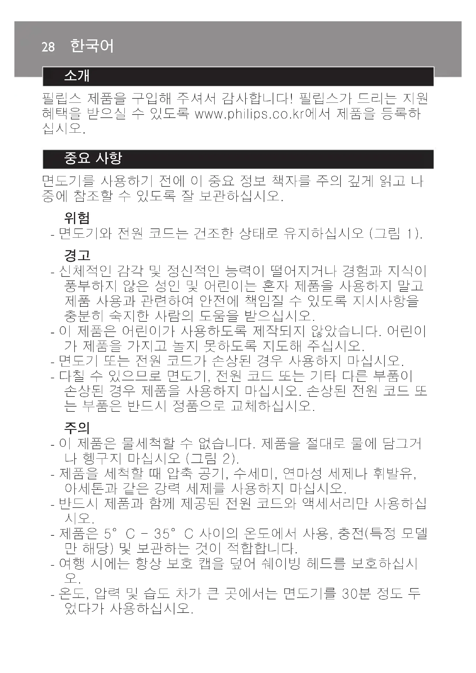 면도기를 사용하기 전에 이 중요 정보 책자를 주의 깊게 읽고 나 중에 참조할 수 있도록 잘 보관하십시오.