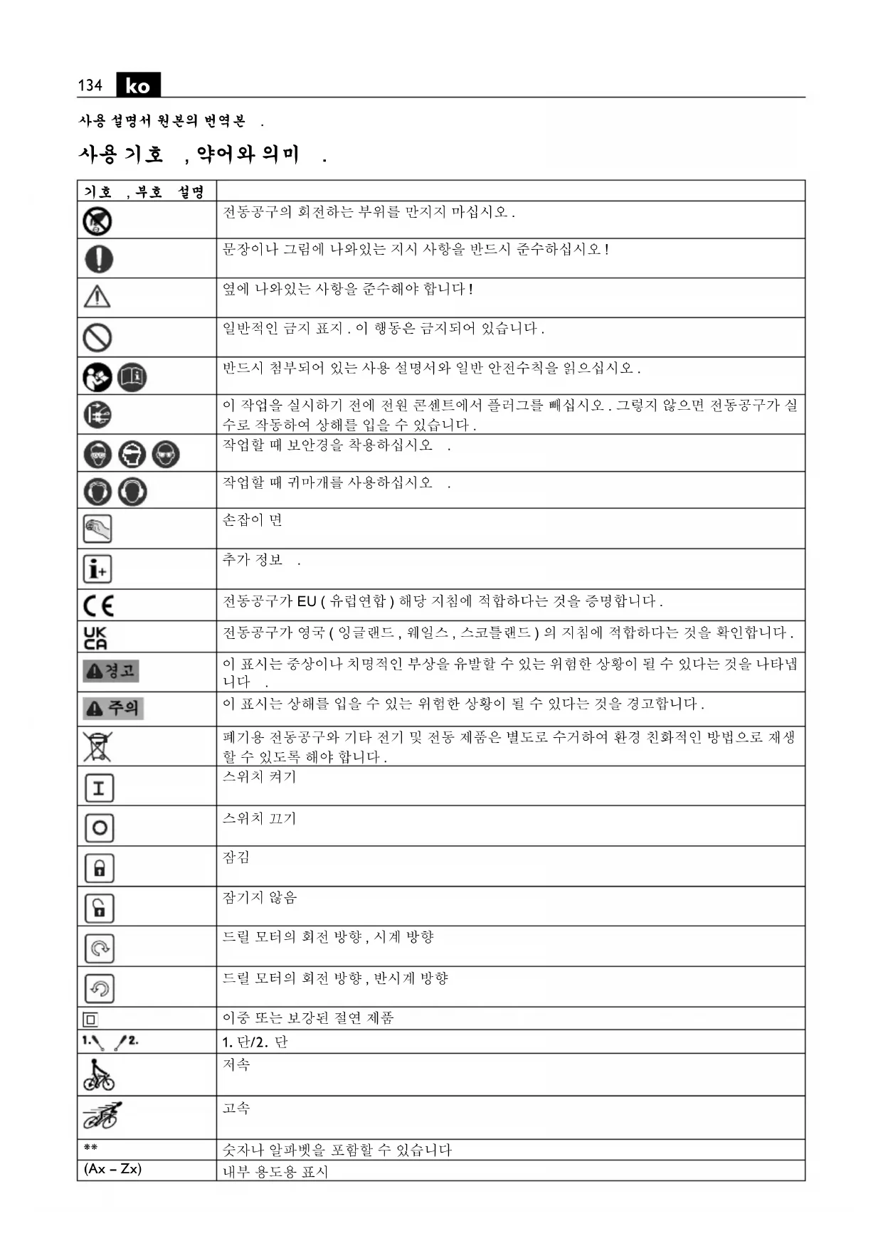 전동공구가 EU ( 유럽연합 ) 해당 지침에 적합하다는 것을 증명합니다 . 전동공구가 영국 ( 잉글랜드 , 웨일스 , 스코틀랜드 ) 의 지침에 적합하다는 것을 확인합니다 . 이 표시는 중상이나 치명적인 부상을 유발할 수 있는 위험한 상황이 될 수 있다는 것을 나타냅