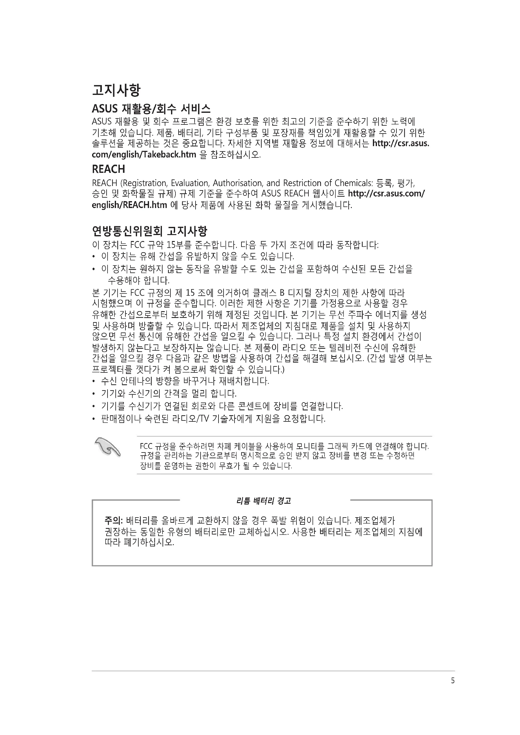 ASUS 재활용/회수 서비스 ASUS 재활용 및 회수 프로그램은 환경 보호를 위한 최고의 기준을 준수하기 위한 노력에 기초해 있습니다. 제품, 배터리, 기타 구성부품 및 포장재를 책임있게 재활용할 수 있기 위한 솔루션을 제공하는 것은 중요합니다. 자세한 지역별 재활용 정보에 대해서는 http://csr.asus. com/english/Takeback.htm 을 참조하십시오. REACH REACH (Registration, Evaluation, Authorisation, and Restriction of Chemicals: 등록, 평가, 승인 및 화학물질 규제) 규제 기준을 준수하여 ASUS REACH 웹사이트 http://csr.asus.com/ english/REACH.htm 에 당사 제품에 사용된 화학 물질을 게시했습니다. 연방통신위원회 고지사항 이 장치는 FCC 규약 15부를 준수합니다. 다음 두 가지 조건에 따라 동작합니다:
