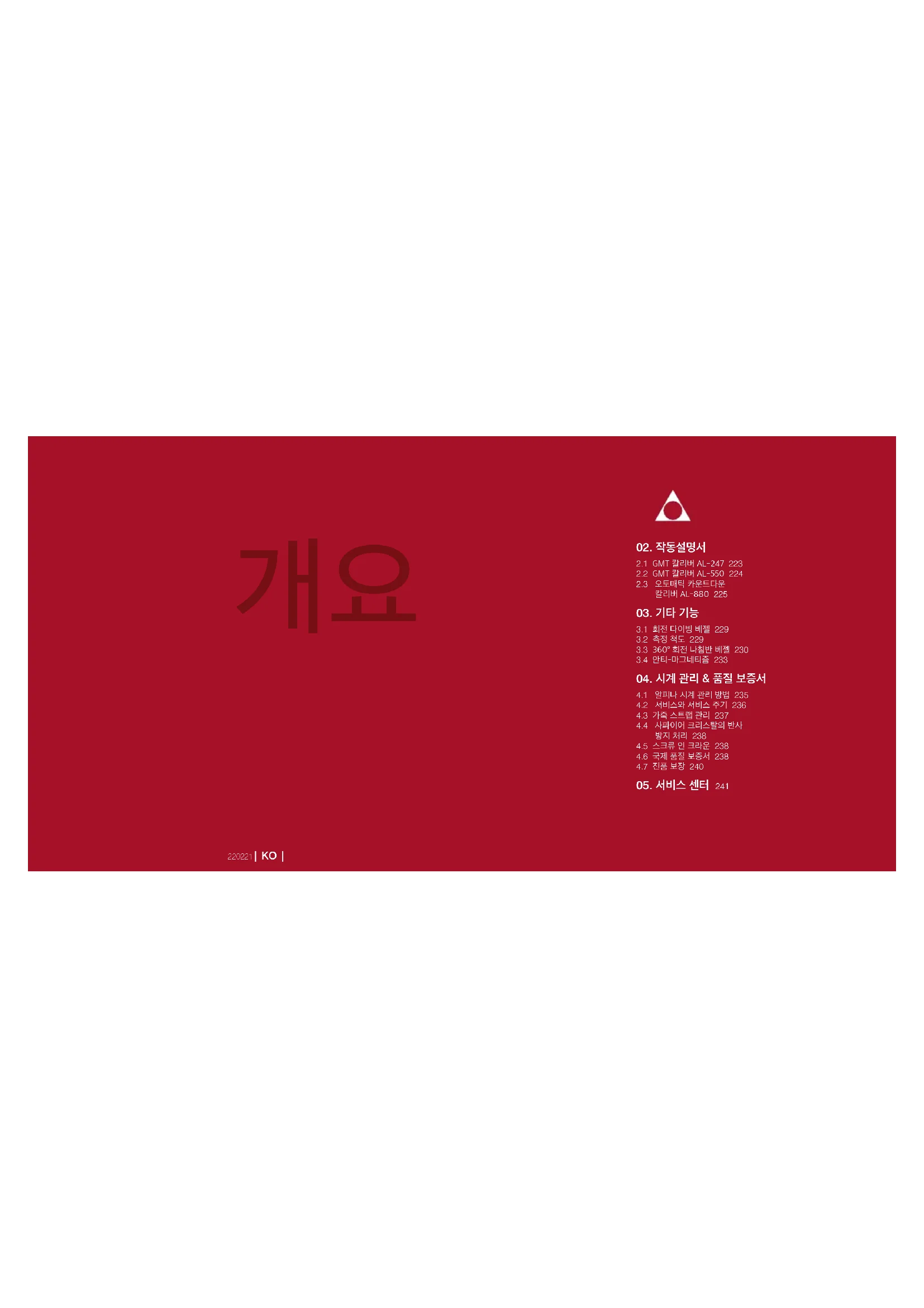 04시계 관리 & 품질 보증서236 237 | KO |방수기능시계의 방수 등급은 자사의 공방에서 시계가 제작될 때 결정되고 확인됩니다. 이것은 시계에 물이 들어가지 않게 하는 것에 대해 영구한 보장을 의미하는 것은 아닙니다.시계는 크라운이 완전히 시계 케이스 쪽으로 밀착된 경우에만 방수 기능을 발휘합니다. 만약 고객님의 시계가 스크류 인 크라운 제품이라면 시계 케이스 안으로 크라운이 단단히 조여져 있어야 합니다. 만약 크라운이 시간 세팅 또는 기타 조정 중의 위치로 되어 있다면 시계의 방수 기능은 유지되지 않습니다. 마찬가지로 시계가 물기에 젖어있거나 물 속에 있는 경우에는 푸셔 버튼을 작동해서는 안됩니다.시간에 따른 노화와 일상적인 사용이 시계의 방수 기능에 영향을 미칠 수 있습니다. (뜨거운 태양 아래 오랜 시간 노출시켰던 시계를 차가운 물에 넣는 등의) 급격한 온도 변화를 피해주십시오. 이는 다른 충격들 – 화학적, 물리적 또는 기타 - 과 마찬가지로 가스켓에 손상을 줄 수 있으며 이로 인해 시계 케이스의 온전한 상태가 유지되기 어려울 수 있습니다.올바른 방수 기능의 작동을 위하여 고객님의 시계를 2-3년에 한 번씩 공식 알피나 판매점이나 서비스 센터에서 점검 받으시길 권합니다.