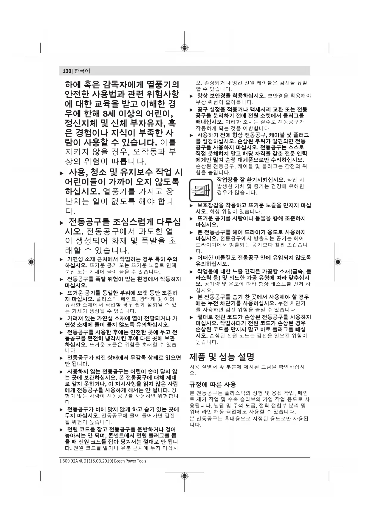 모든 안전 수칙과 지침을 숙지하십시오. 다음의 안전 수칙과 지침을 준수하지 않 으면 화재 위험이 있으며 감전 혹은 중 상을 입을 수 있습니다. 안전 수칙과 지침서는 계속 보관하시기 바랍니다. u 본 열풍기는 어린이나 정신지체 및 신체 부자유자 혹은 경험이 나 지식이 부족한 사람이 사용 하기에 적합하지 않습니다. 본 열풍기는 안전 책임자의 감독 Bosch Power Tools 1 609 92A 4UD | (15.03.2019)120 | 한국어 하에 혹은 감독자에게 열풍기의 안전한 사용법과 관련 위험사항 에 대한 교육을 받고 이해한 경 우에 한해 8세 이상의 어린이, 정신지체 및 신체 부자유자, 혹 은 경험이나 지식이 부족한 사 람이 사용할 수 있습니다. 이를 지키지 않을 경우, 오작동과 부 상의 위험이 따릅니다. u 사용, 청소 및 유지보수 작업 시 어린이들이 가까이 오지 않도록 하십시오. 열풍기를 가지고 장 난치는 일이 없도록 해야 합니