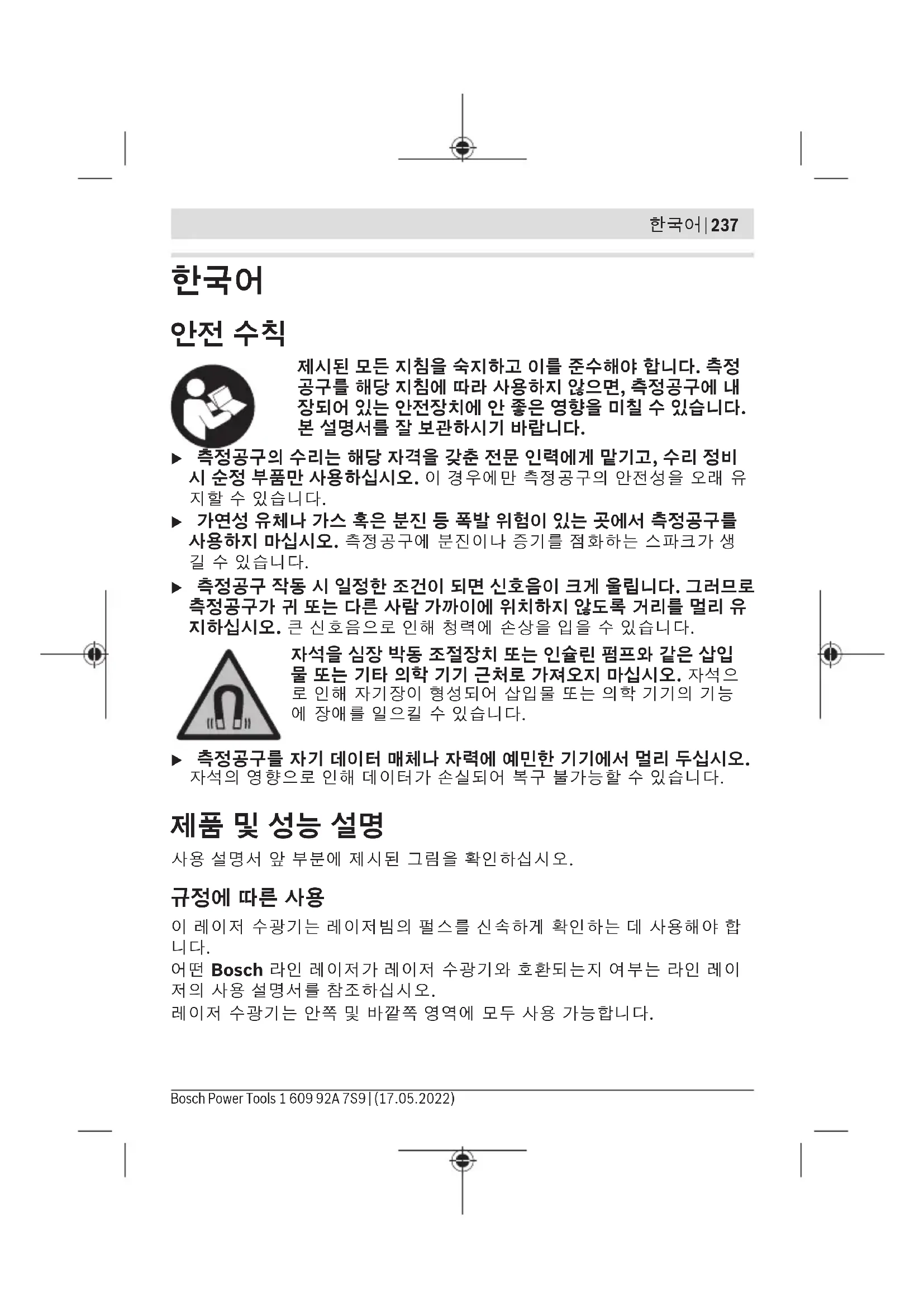 어떤Bosch 라인 레이저가 레이저 수광기와 호환되는지 여부는 라인 레이 저의 사용 설명서를 참조하십시오. 레이저 수광기는 안쪽 및 바깥쪽 영역에 모두 사용 가능합니다. Bosch Power Tools 1 609 92A 7S9 | (17.05.2022)238 | 한국어