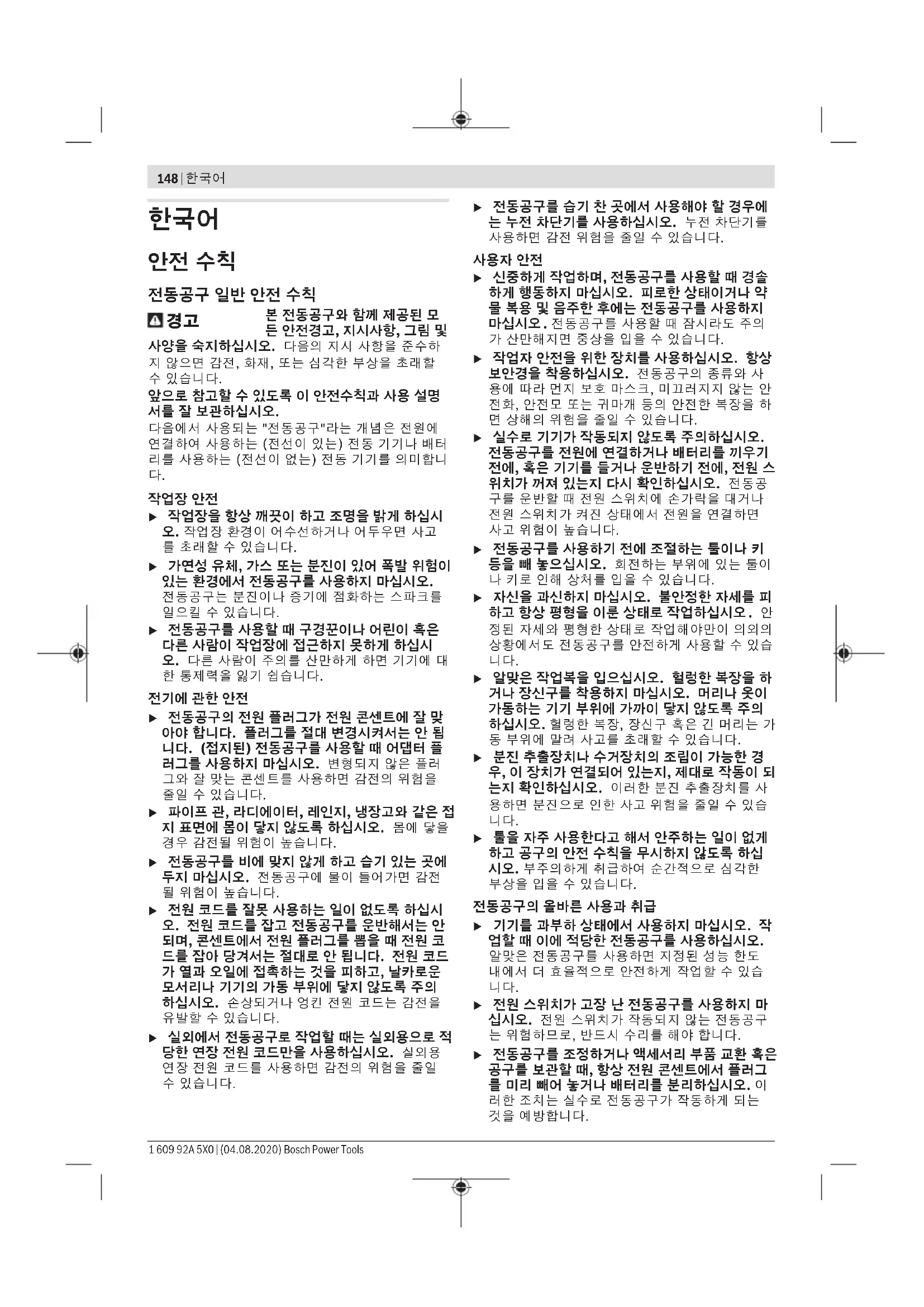 모든 안전 수칙과 지침을 숙지하십시오. 다음의 안전 수칙과 지침을 준수하지 않 으면 화재 위험이 있으며 감전 혹은 중 상을 입을 수 있습니다. Bosch Power Tools 1 609 92A 5X0 | (04.08.2020)150 | 한국어 사용 설명서 앞 부분에 제시된 그림을 확인하십시