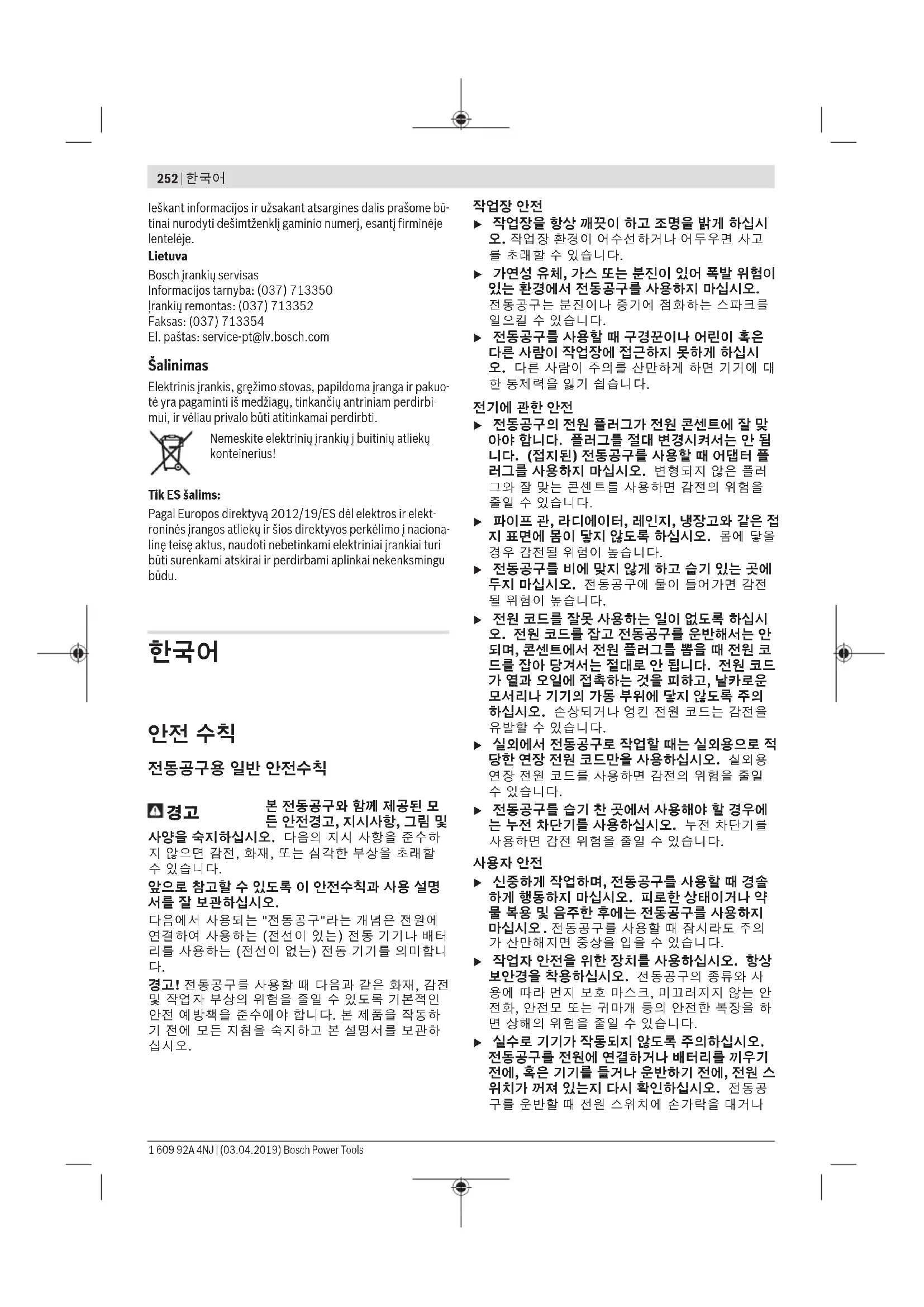 - www.bosch-pt.com 보쉬 사용 문의 팀에서는 보쉬의 제품 및 해당 액세 서리에 관한 질문에 기꺼이 답변 드릴 것입니다. Bosch Power Tools 1 609 92A 4NJ | (03.04.2019)260 | 한국어 문의나 대체 부품 주문 시에는 반드시 제품 네임 플 레이트에 있는 10자리의 부품번호를 알려 주십시