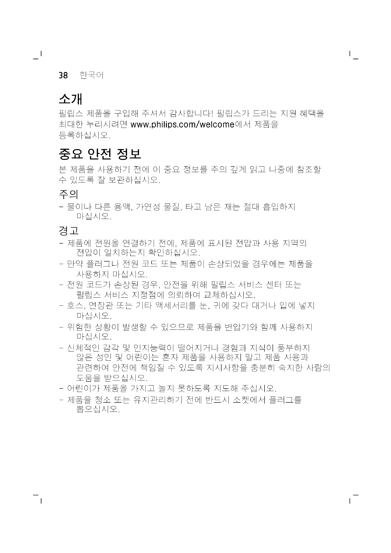 - 전원 코드가 손상된 경우, 안전을 위해 필립스 서비스 센터 또는 필립스 서비스 지정점에 의뢰하여 교체하십시오. - 호스, 연장관 또는 기타 액세서리를 눈, 귀에 갖다 대거나 입에 넣지