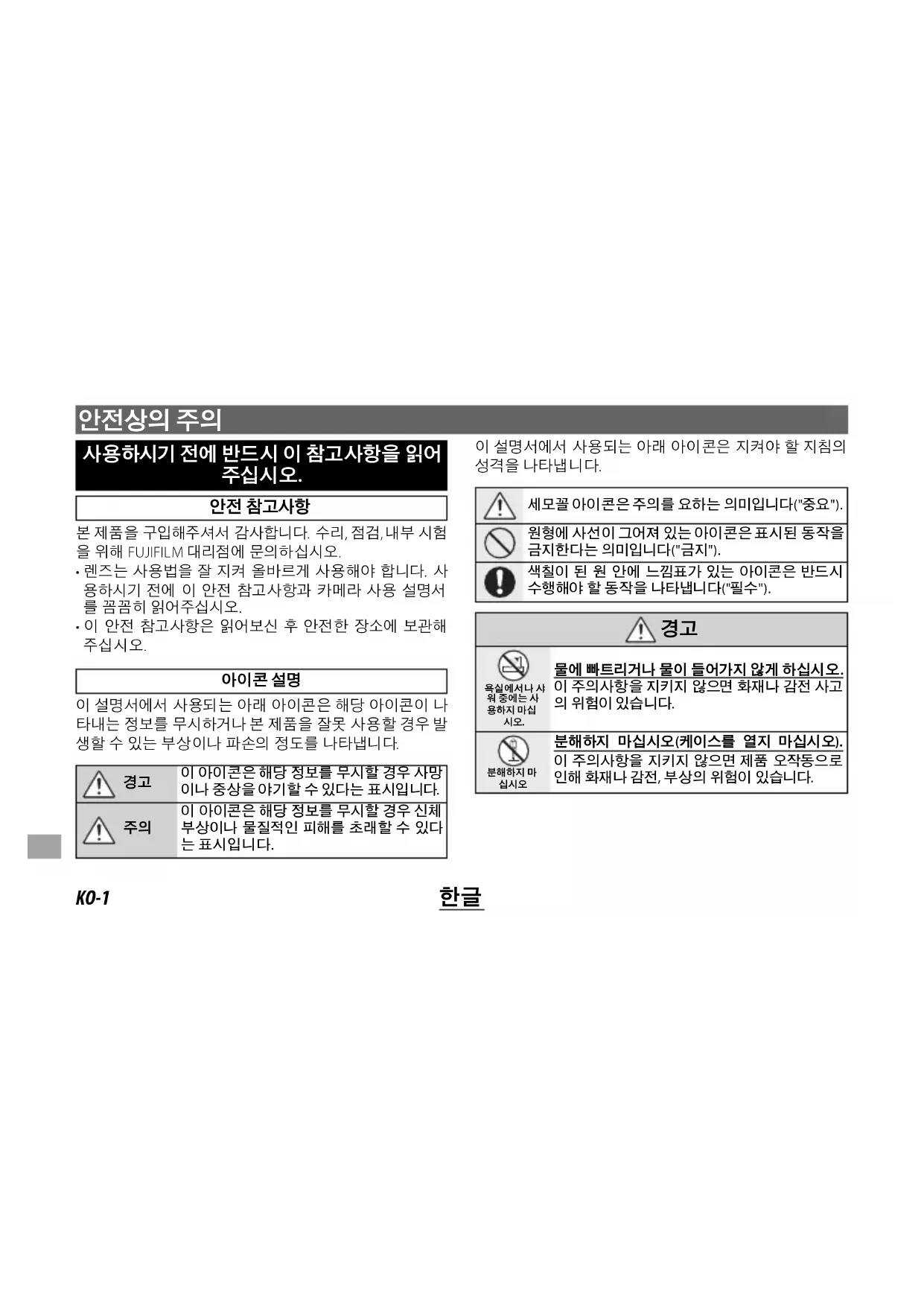 세모꼴 아이콘은 주의를 요하는 의미입니다("중요"). 원형에 사선이 그어져 있는 아이콘은 표시된 동작을 금지한다는 의미입니다("금지"). 색칠이 된 원 안에 느낌표가 있는 아이콘은 반드시 수행해야 할 동작을 나타냅니다("필수").