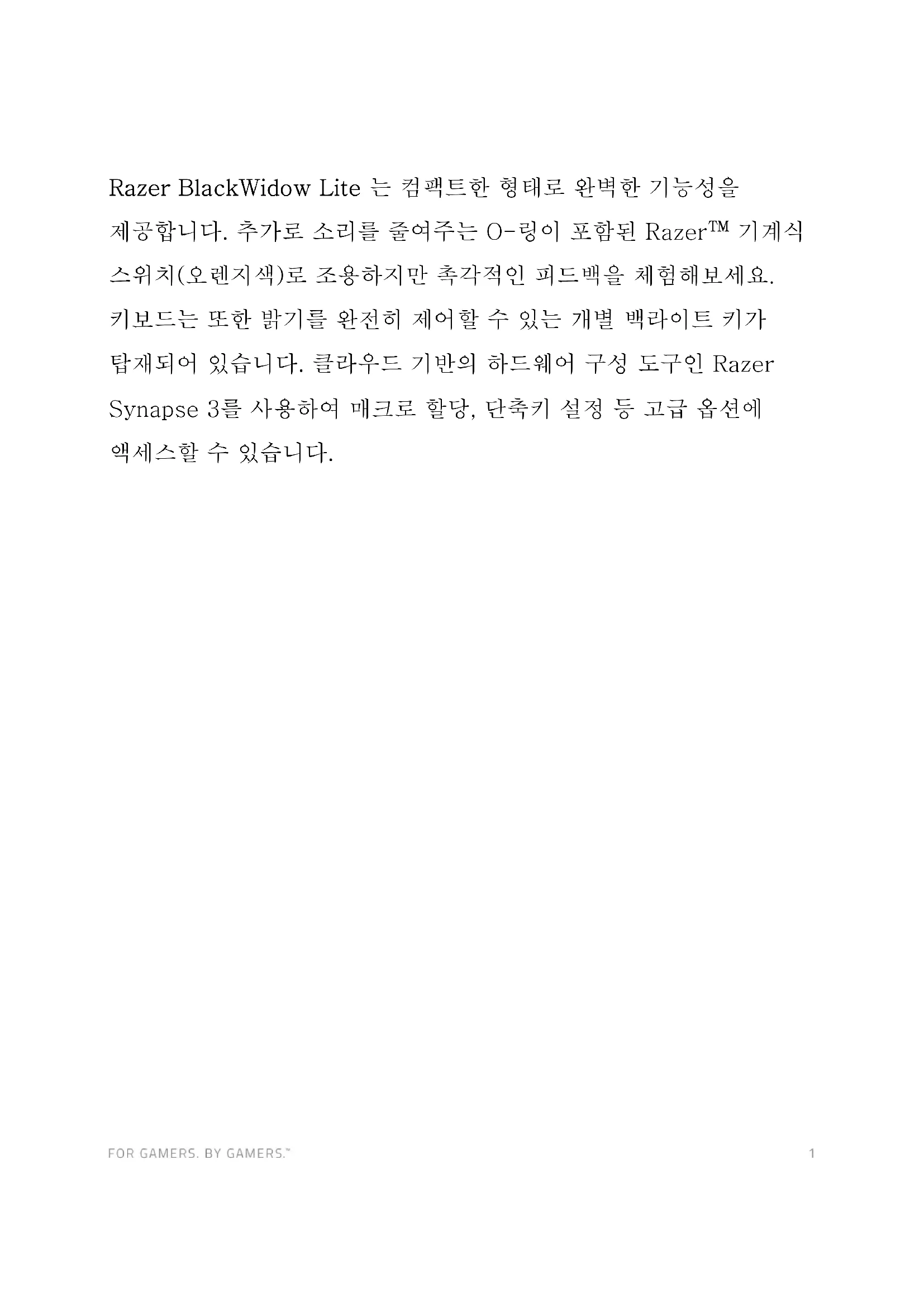 마스터 가이드Razer BlackWidow Lite 는 컴팩트한 형태로 완벽한 기능성을 제공합니다. 추가로 소리를 줄여주는 O-링이 포함된 Razer™ 기계식 스위치(오렌지색)로 조용하지만 촉각적인 피드백을 체험해보세요. 키보드는 또한 밝기를 완전히 제어할 수 있는 개별 백라이트 키가 탑재되어 있습니다. 클라우드 기반의 하드웨어 구성 도구인 Razer Synapse 3를 사용하여 매크로 할당, 단축키 설정 등 고급 옵션에 액세스할 수 있습니다.목차