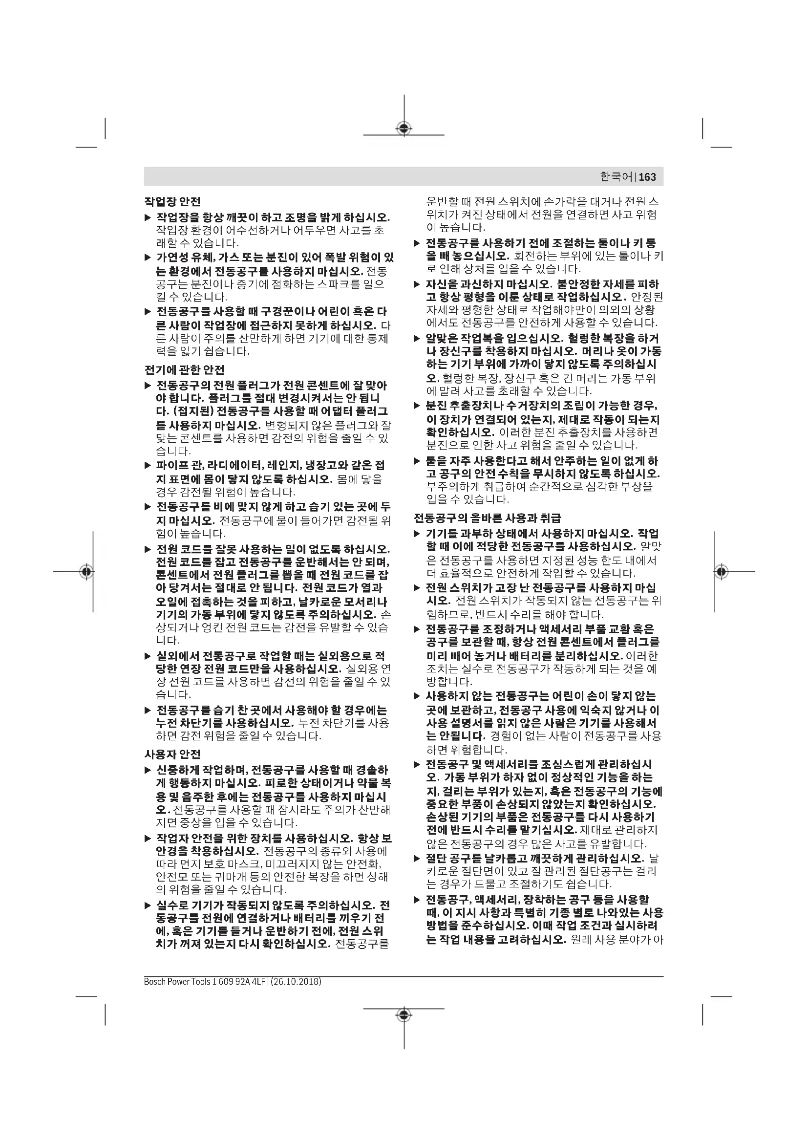 한국어 | 165 Bosch Power Tools 1 609 92A 4LF | (26.10.2018)166 | 한국어 1 609 92A 4LF | (26.10.2018) Bosch Power Tools 작업용 재료에 관해 국가가 지정한 규정을 고려하십