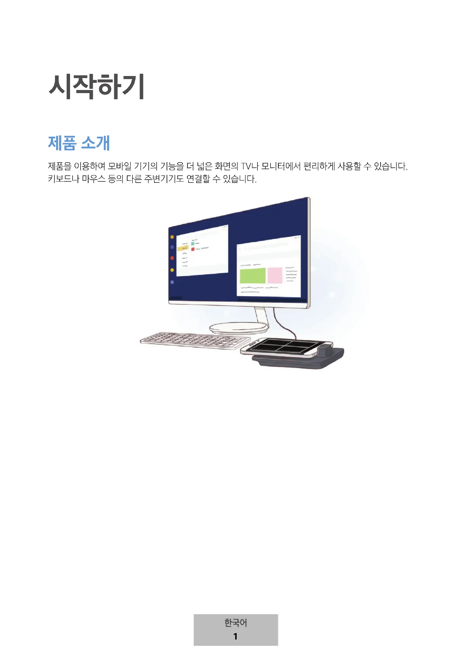 제품을 이용하여 모바일 기기의 기능을 더 넓은 화면의 TV나 모니터에서 편리하게 사용할 수 있습니다. 키보드나 마우스 등의 다른 주변기기도 연결할 수 있습니다.