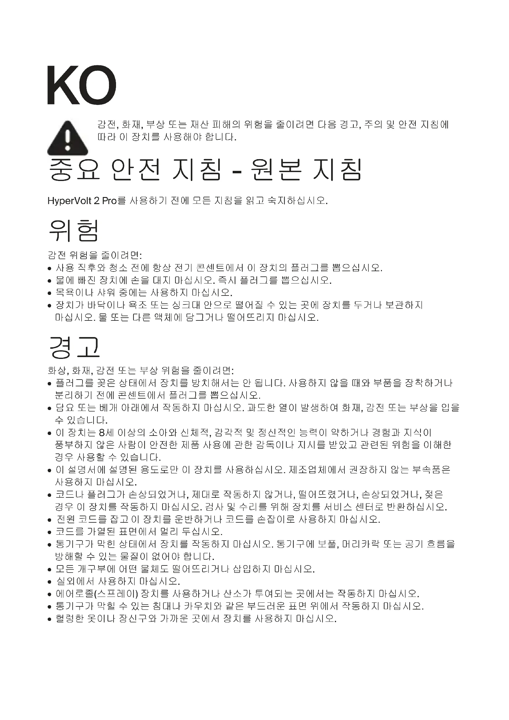 10KO 감전, 화재, 부상 또는 재산 피해의 위험을 줄이려면 다음 경고, 주의 및 안전 지침에 따라 이 장치를 사용해야 합니다. 중요 안전 지침 - 원본 지침 HyperVolt 2 Pro를 사용하기 전에 모든 지침을 읽고 숙지하십시오.