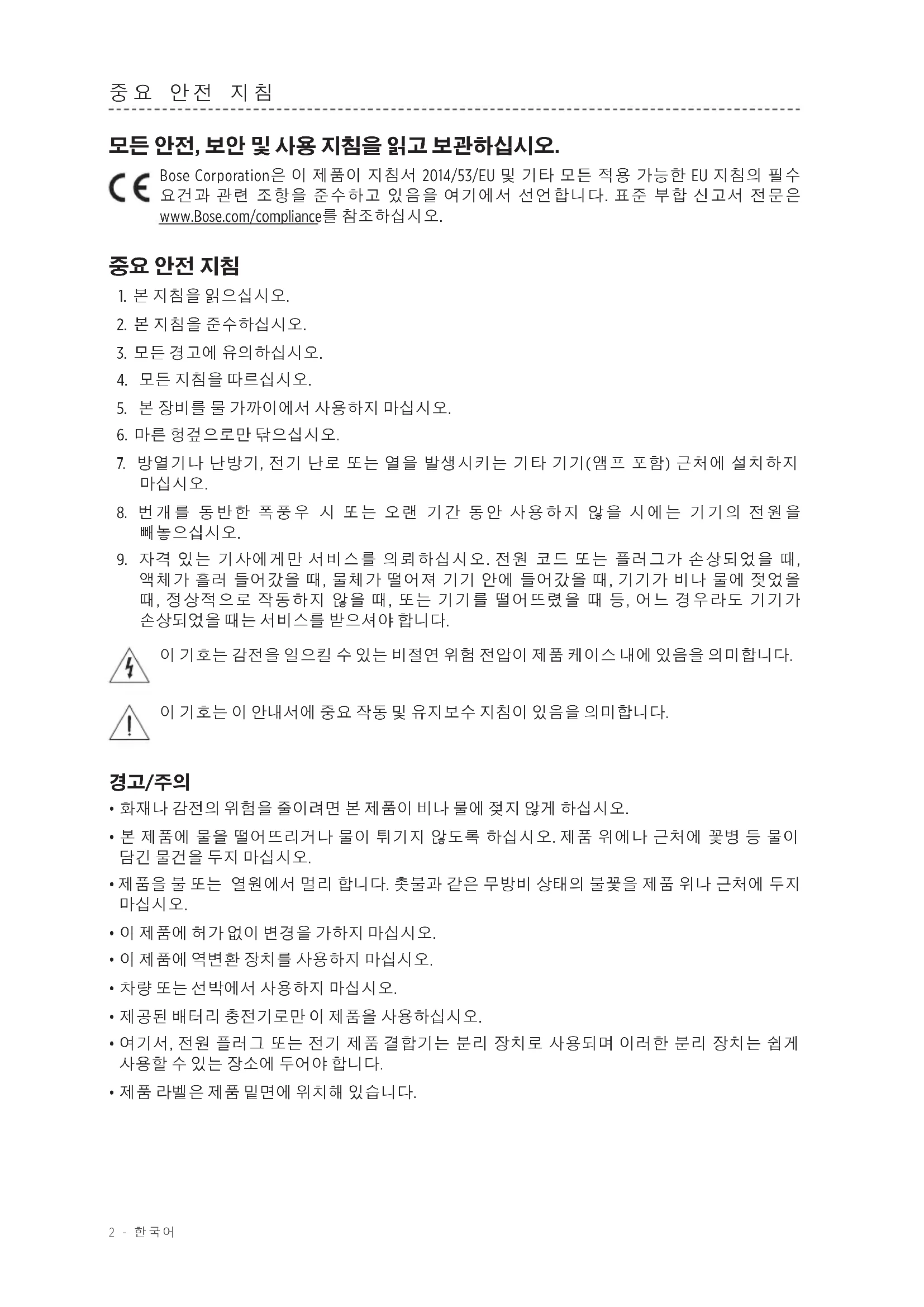 모든 안전, 보안 및 사용 지침을 읽고 보관하십시오. Bose Corporation은 이 제품이 지침서 2014/53/EU 및 기타 모든 적용 가능한 EU 지침의 필수 요건과 관련 조항을 준수하고 있음을 여기에서 선언합니다. 표준 부합 신고서 전문은 www.Bose.com/compliance를 참조하십시오.