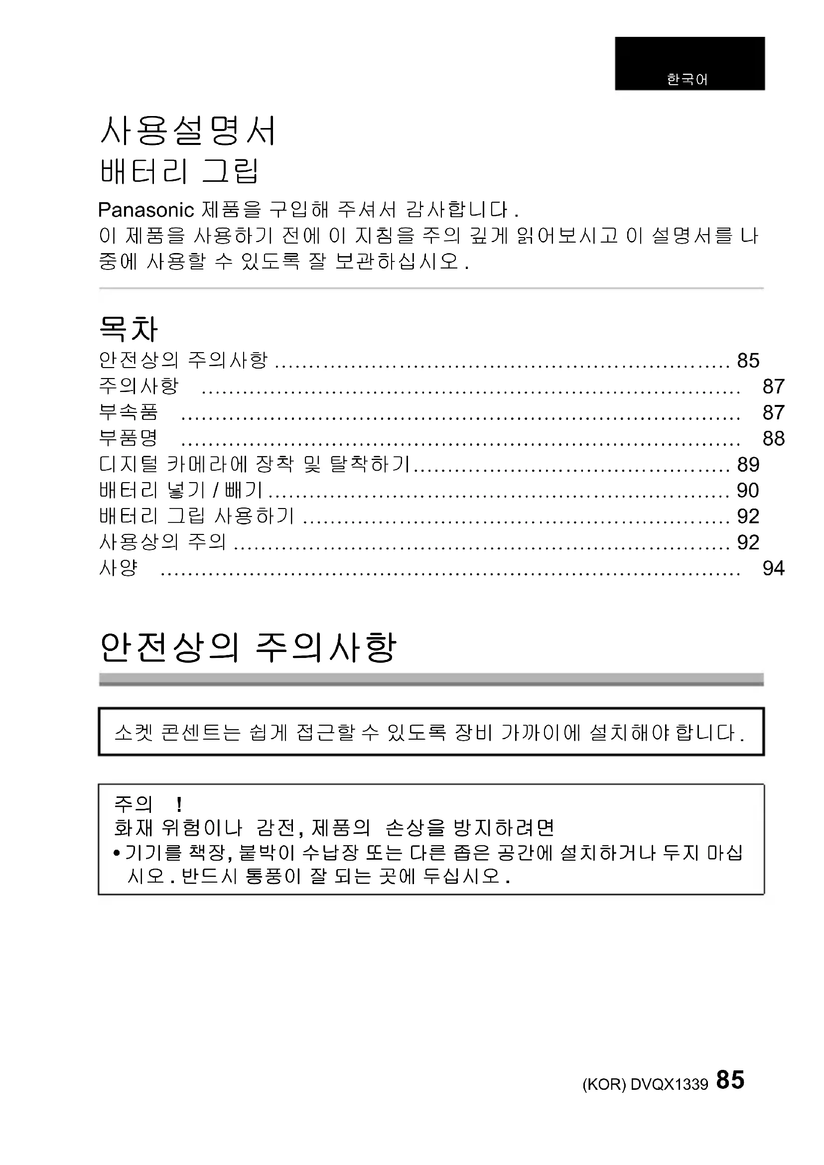 - 구입 시에는 단자 덮개가 배터리 그립 에 부착되어 있습니다 . DVKV1001Z DVQX1339.book 87 ページ 2017年11月14日 火曜日 午前11時3分DVQX1339 (KOR)