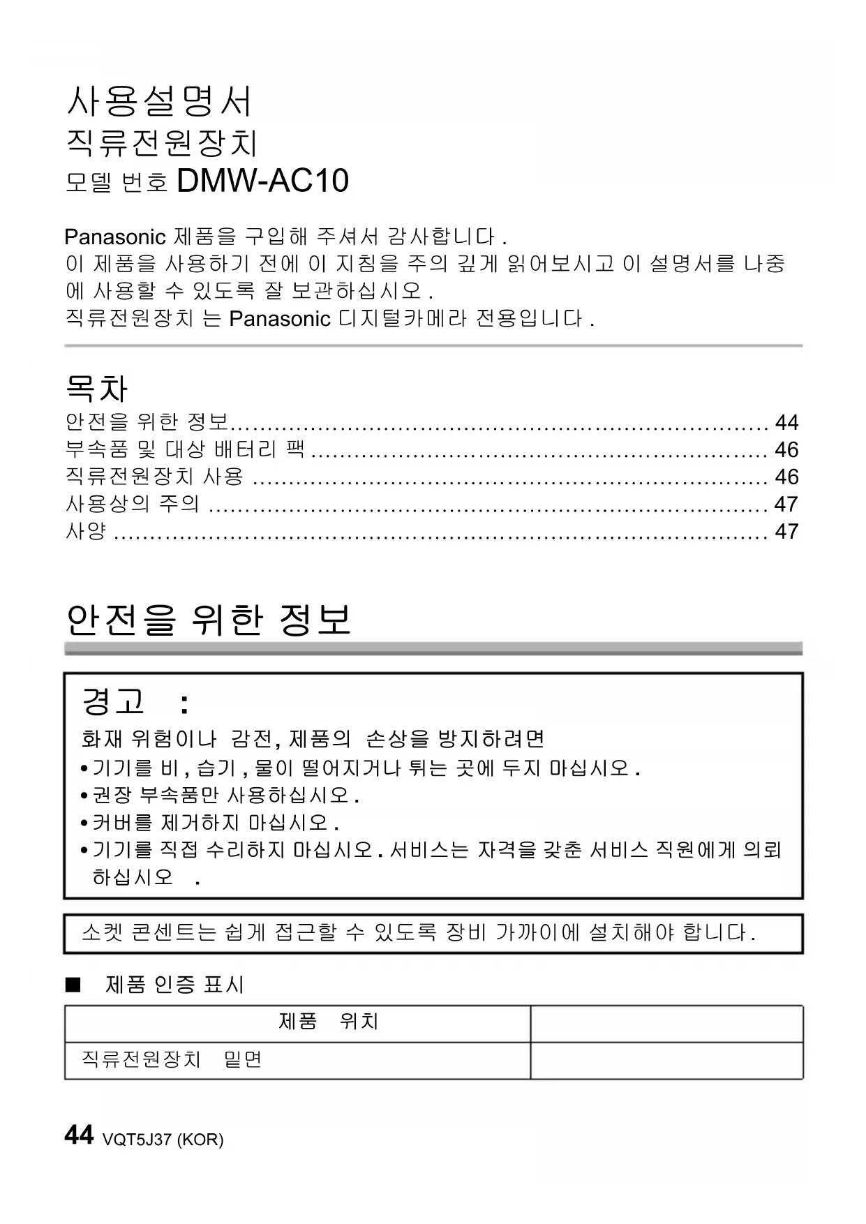 모델 번호 DMW-AC10 Panasonic 제품을 구입해 주셔서 감사합니다 . 이 제품을 사용하기 전에 이 지침을 주의 깊게 읽어보시고 이 설명서를 나중 에 사용할 수 있도록 잘 보관하십시오 . 직류전원장치 는 Panasonic 디지털카메라 전용입니다 .