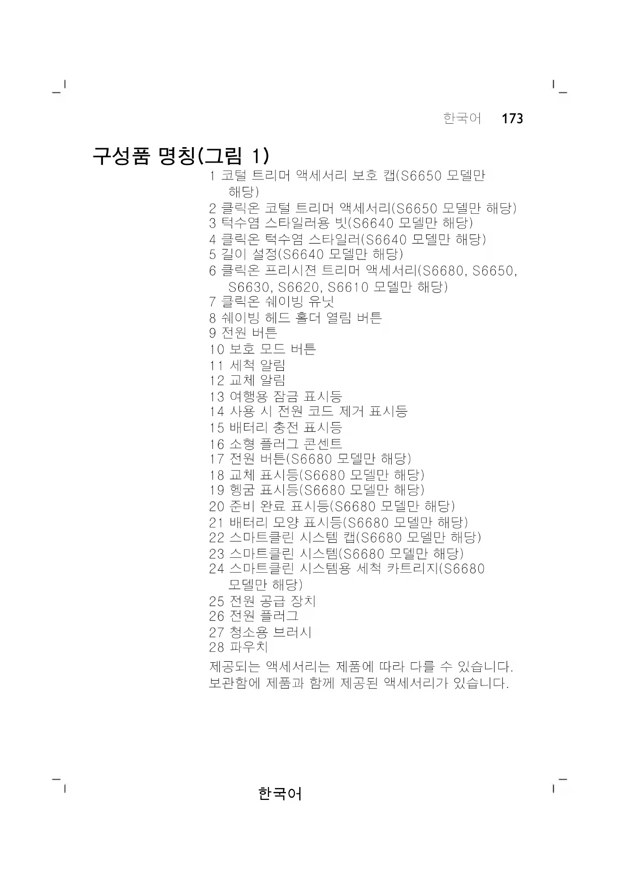 25 전원 공급 장치 26 전원 플러그 27 청소용 브러시 28 파우치 제공되는 액세서리는 제품에 따라 다를 수 있습니다. 보관함에 제품과 함께 제공된 액세서리가 있습니다.