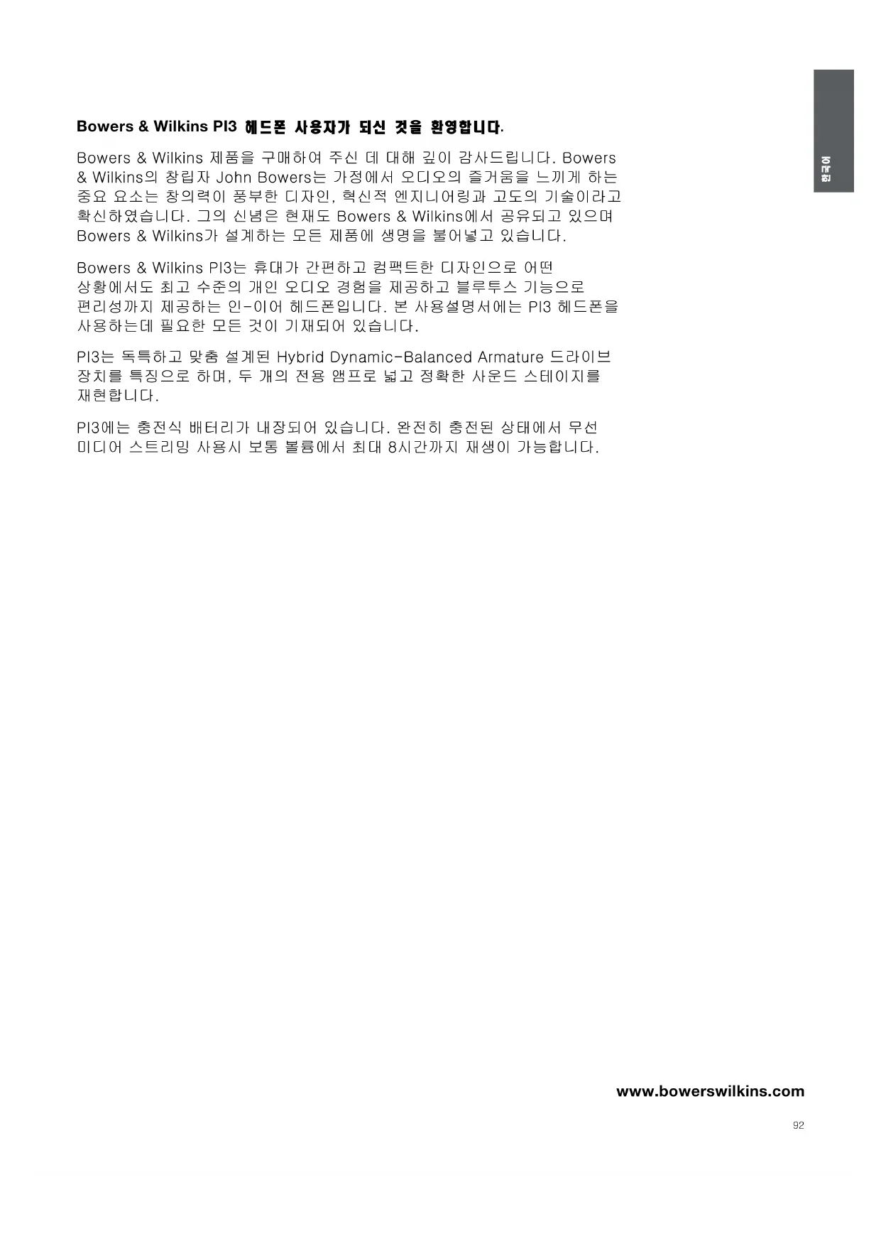 www.bowerswilkins.com Bowers & Wilkins PI3 헤드폰 사용자가 되신 것을 환영합니다. Bowers & Wilkins 제품을 구매하여 주신 데 대해 깊이 감사드립니다. Bowers & Wilkins의 창립자 John Bowers는 가정에서 오디오의 즐거움을 느끼게 하는 중요 요소는 창의력이 풍부한 디자인, 혁신적 엔지니어링과 고도의 기술이라고 확신하였습니다. 그의 신념은 현재도 Bowers & Wilkins에서 공유되고 있으며 Bowers & Wilkins가 설계하는 모든 제품에 생명을 불어넣고 있습니다. Bowers & Wilkins PI3는 휴대가 간편하고 컴팩트한 디자인으로 어떤 상황에서도 최고 수준의 개인 오디오 경험을 제공하고 블루투스 기능으로 편리성까지 제공하는 인-이어 헤드폰입니다. 본 사용설명서에는 PI3 헤드폰을 사용하는데 필요한 모든 것이 기재되어 있습니다. PI3는 독특하고 맞춤 설계된 Hybrid Dynamic-Balanced Armature 드라이브 장치를 특징으로 하며, 두 개의 전용 앰프로 넓고 정확한 사운드 스테이지를