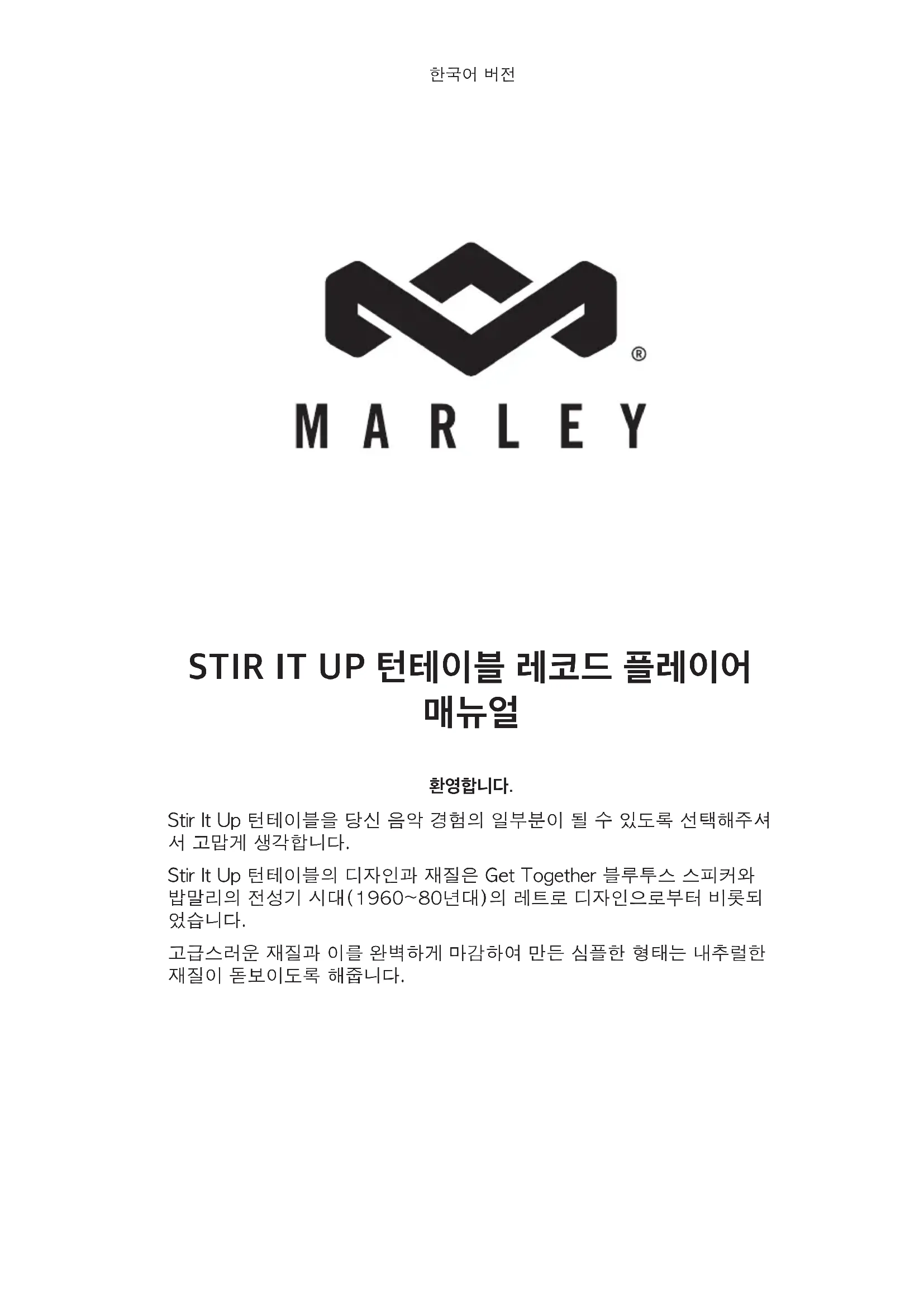 Stir It Up 턴테이블을 당신 음악 경험의 일부분이 될 수 있도록 선택해주셔 서 고맙게 생각합니다. Stir It Up 턴테이블의 디자인과 재질은 Get Together 블루투스 스피커와 밥말리의 전성기 시대(1960~80년대)의 레트로 디자인으로부터 비롯되