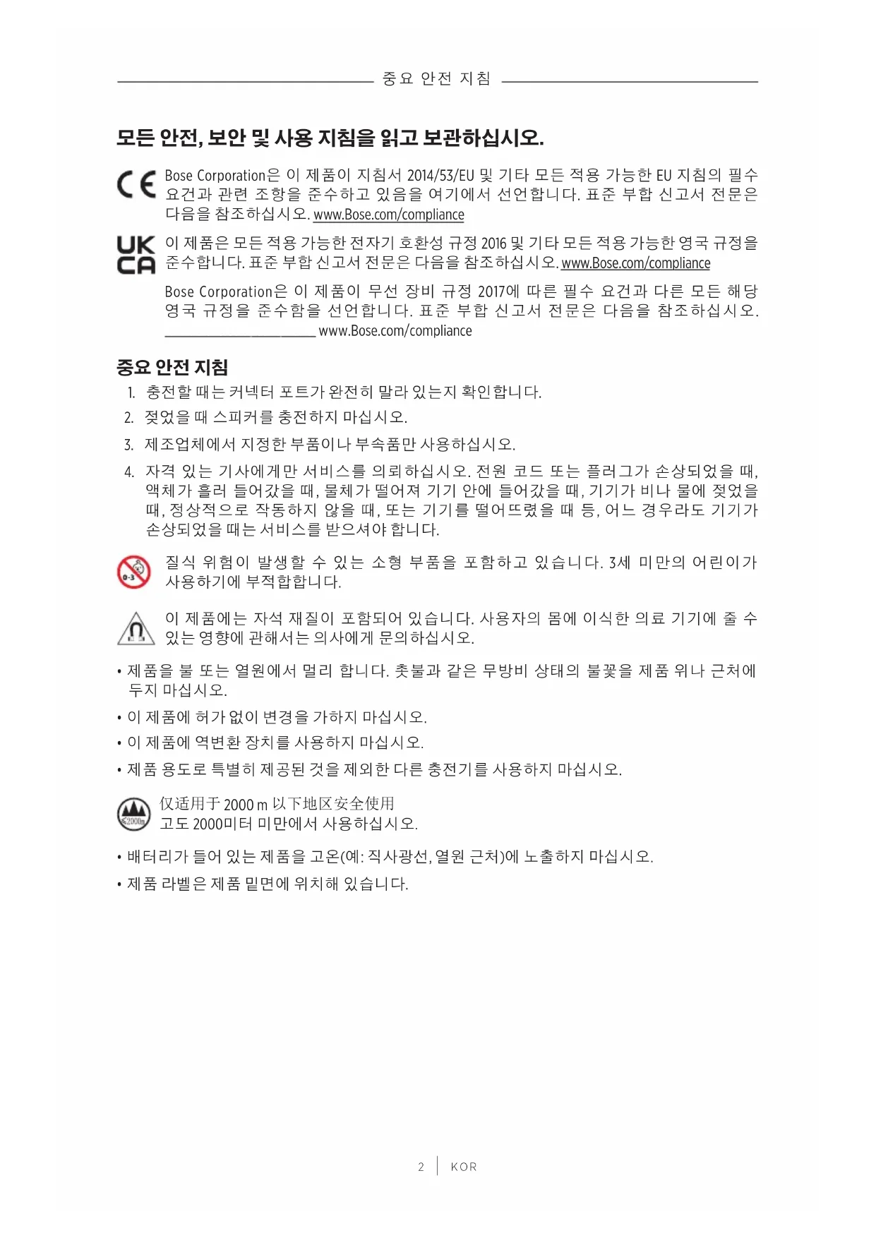 Bose Corporation은 이 제품이 지침서 2014/53/EU 및 기타 모든 적용 가능한 EU 지침의 필수 요건과 관련 조항을 준수하고 있음을 여기에서 선언합니다. 표준 부합 신고서 전문은 다음을 참조하십시오. www.Bose.com/compliance