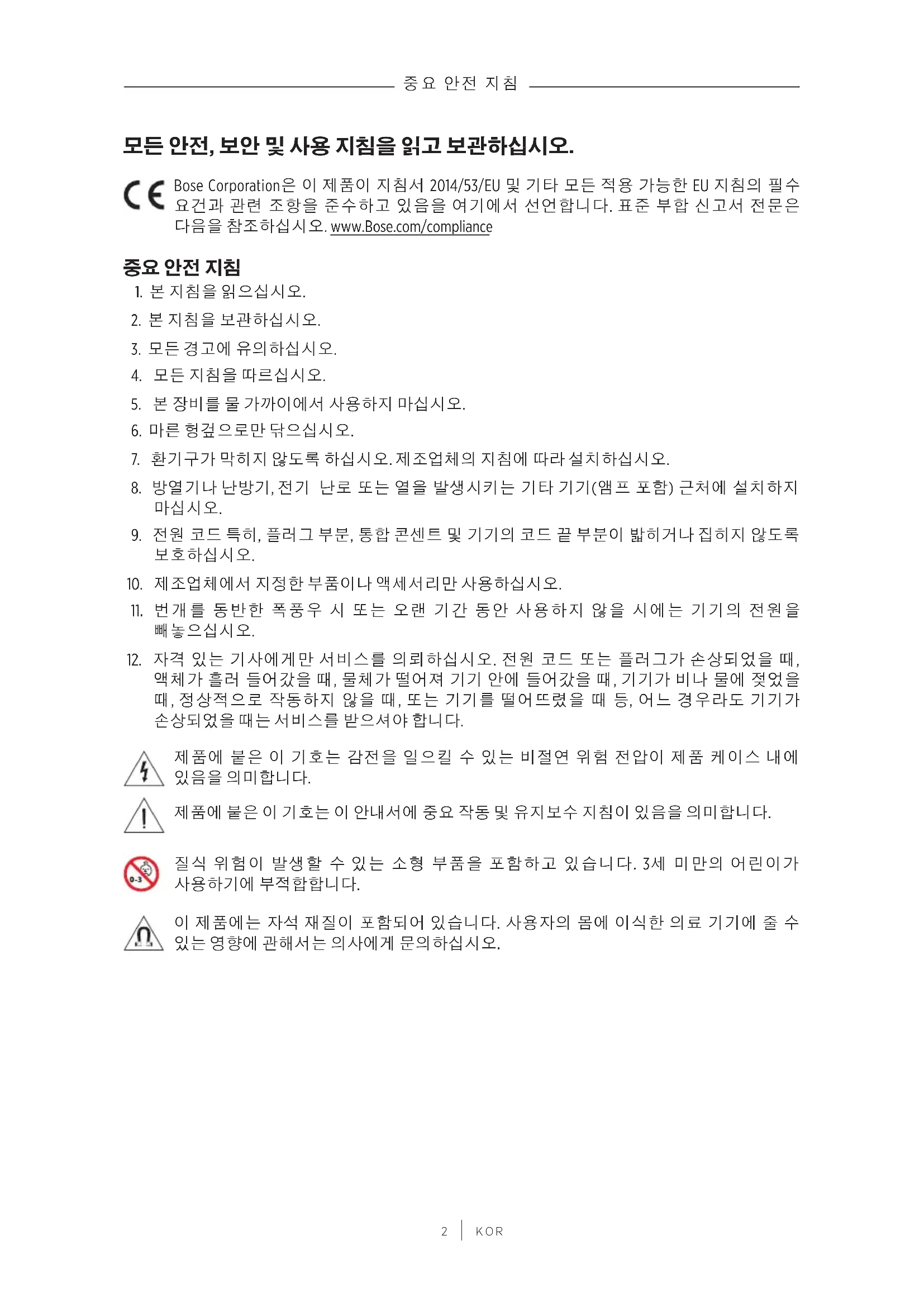 KOR 모든 안전, 보안 및 사용 지침을 읽고 보관하십시오. Bose Corporation은 이 제품이 지침서 2014/53/EU 및 기타 모든 적용 가능한 EU 지침의 필수 요건과 관련 조항을 준수하고 있음을 여기에서 선언합니다. 표준 부합 신고서 전문은 다음을 참조하십시오. www.Bose.com/compliance