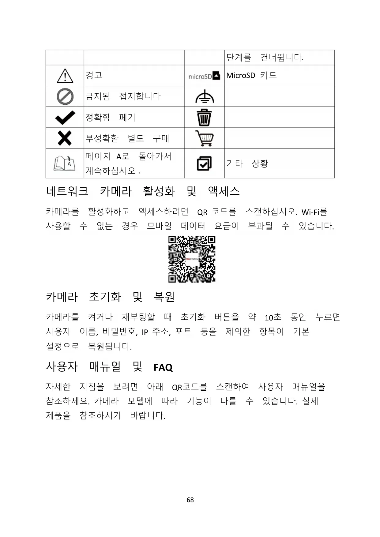 네트워크 카메라 활성화 및 액세스 카메라를 활성화하고 액세스하려면 QR 코드를 스캔하십시오. Wi-Fi를 사용할 수 없는 경우 모바일 데이터 요금이 부과될 수 있습니다. 카메라 초기화 및 복원 카메라를 켜거나 재부팅할 때 초기화 버튼을 약 10초 동안 누르면 사용자 이름, 비밀번호, IP 주소, 포트 등을 제외한 항목이 기본 설정으로 복원됩니다. 사용자 매뉴얼 및 FAQ 자세한 지침을 보려면 아래 QR코드를 스캔하여 사용자 매뉴얼을 참조하세요. 카메라 모델에 따라 기능이 다를 수 있습니다. 실제 제품을 참조하시기 바랍니다.69 열화상 네트워크 뷸렛