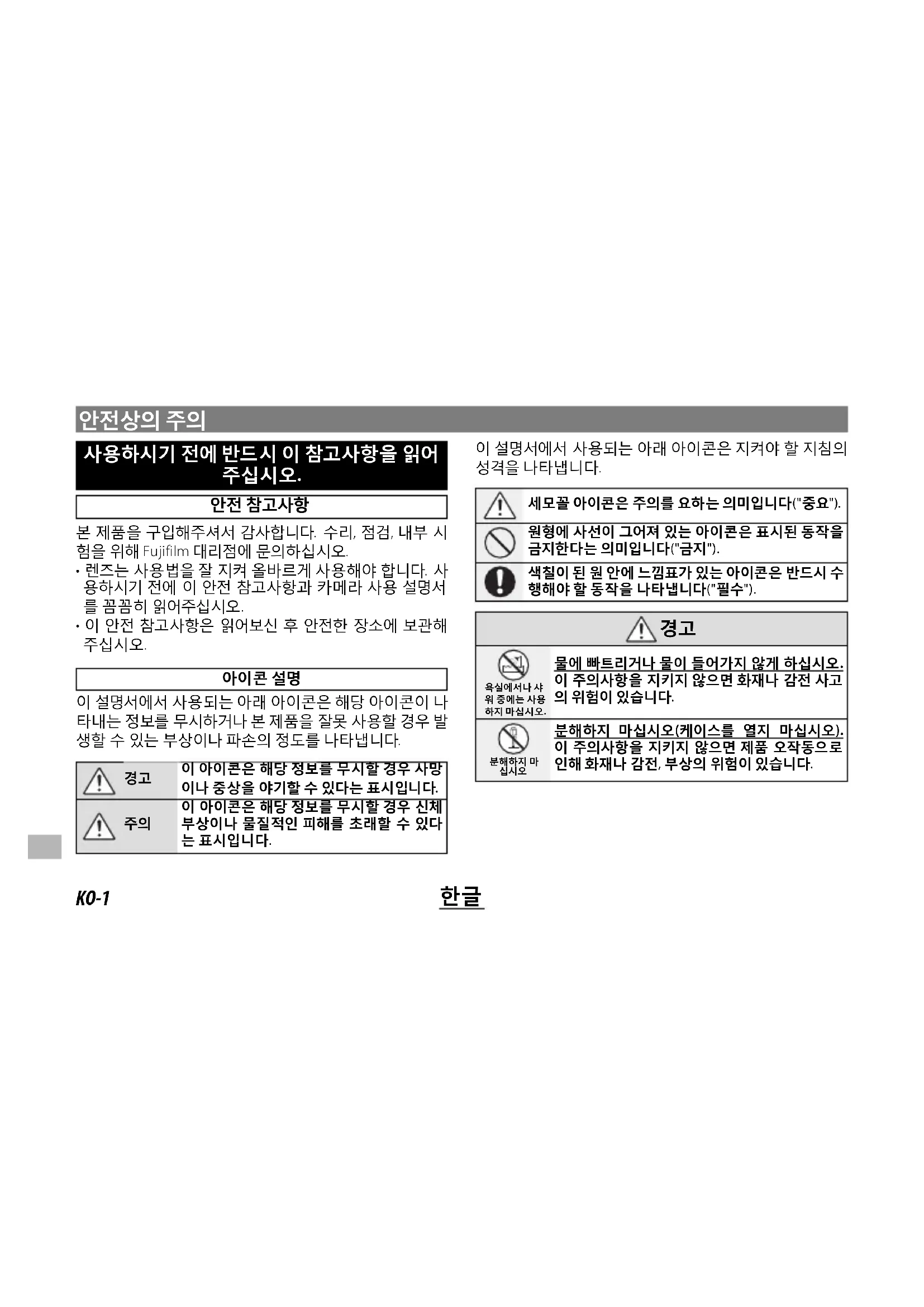- 렌즈는 사용법을 잘 지켜 올바르게 사용해야 합니다. 사 용하시기 전에 이 안전 참고사항과 카메라 사용 설명서 를 꼼꼼히 읽어주십시오.