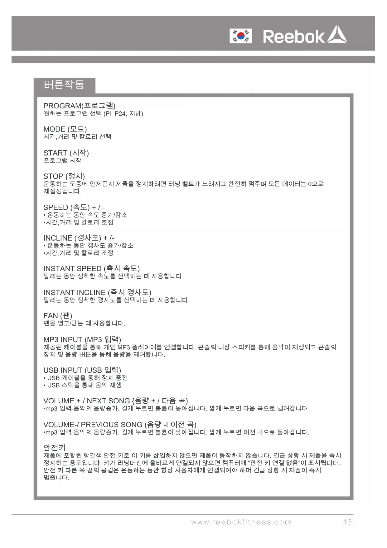 - 시간,거리 및 칼로리 조정 INSTANT SPEED (측시 속도) 달리는 동안 정확한 속도를 선택하는 데 사용합니다. INSTANT INCLINE (즉시 경사도) 달리는 동안 정확한 경사도를 선택하는 데 사용합니다. FAN (팬) 팬을 열고/닫는 데 사용합니다. MP3 INPUT (MP3 입력) 제공된 케이블을 통해 개인 MP3 플레이어를 연결합니다. 콘솔의 내장 스피커를 통해 음악이 재생되고 콘솔의 장지 및 음량 버튼을 통해 음량율 제어합니다. USB INPUT (USB 입력)
