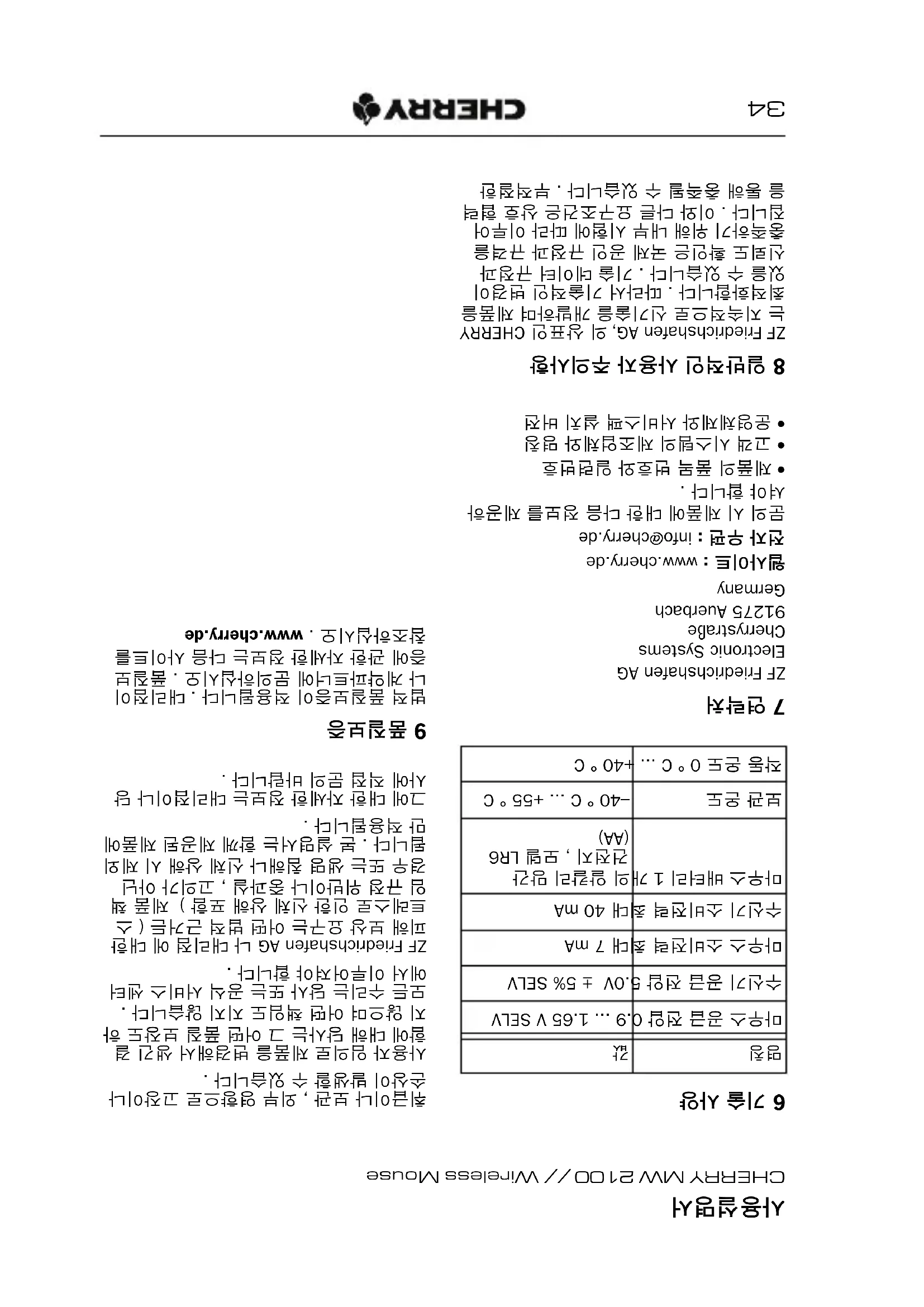 그에 대한 자세한 정보는 대리점이나 당 사에 직접 문의 바랍니다 . 9 품질보증 법적 품질보증이 적용됩니다 . 대리점이 나 계약파트너에 문의하십시오 . 품질보 증에 관한 자세한 정보는 다음 사이트를 참조하십시오 . www.cherry.de