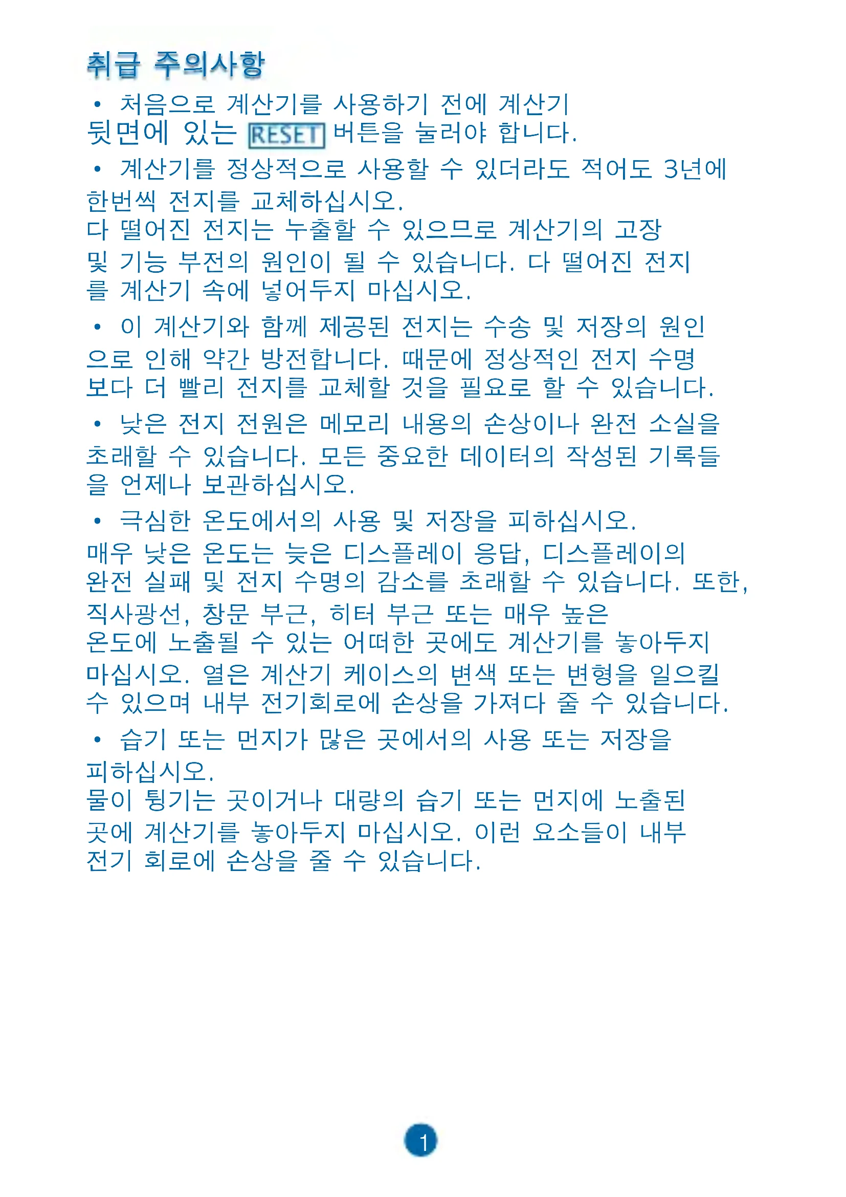물이 튕기는 곳이거나 대량의 습기 또는 먼지에 노출된 곳에 계산기를 놓아두지 마십시오. 이런 요소들이 내부 전기 회로에 손상을 줄 수 있습니다.2