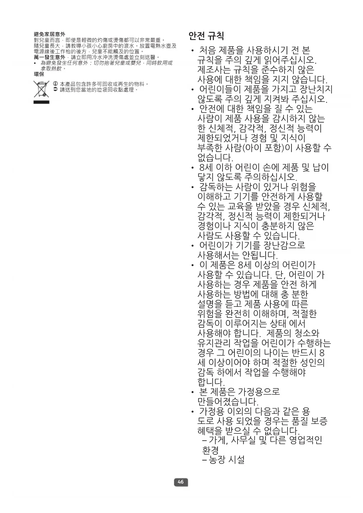 - 감독하는 사람이 있거나 위험을 이해하고 기기를 안전하게 사용할 수 있는 교육을 받았을 경우 신체적, 감각적, 정신적 능력이 제한되거나 경험이나 지식이 충분하지 않은 사람도 사용할 수 있습니다.