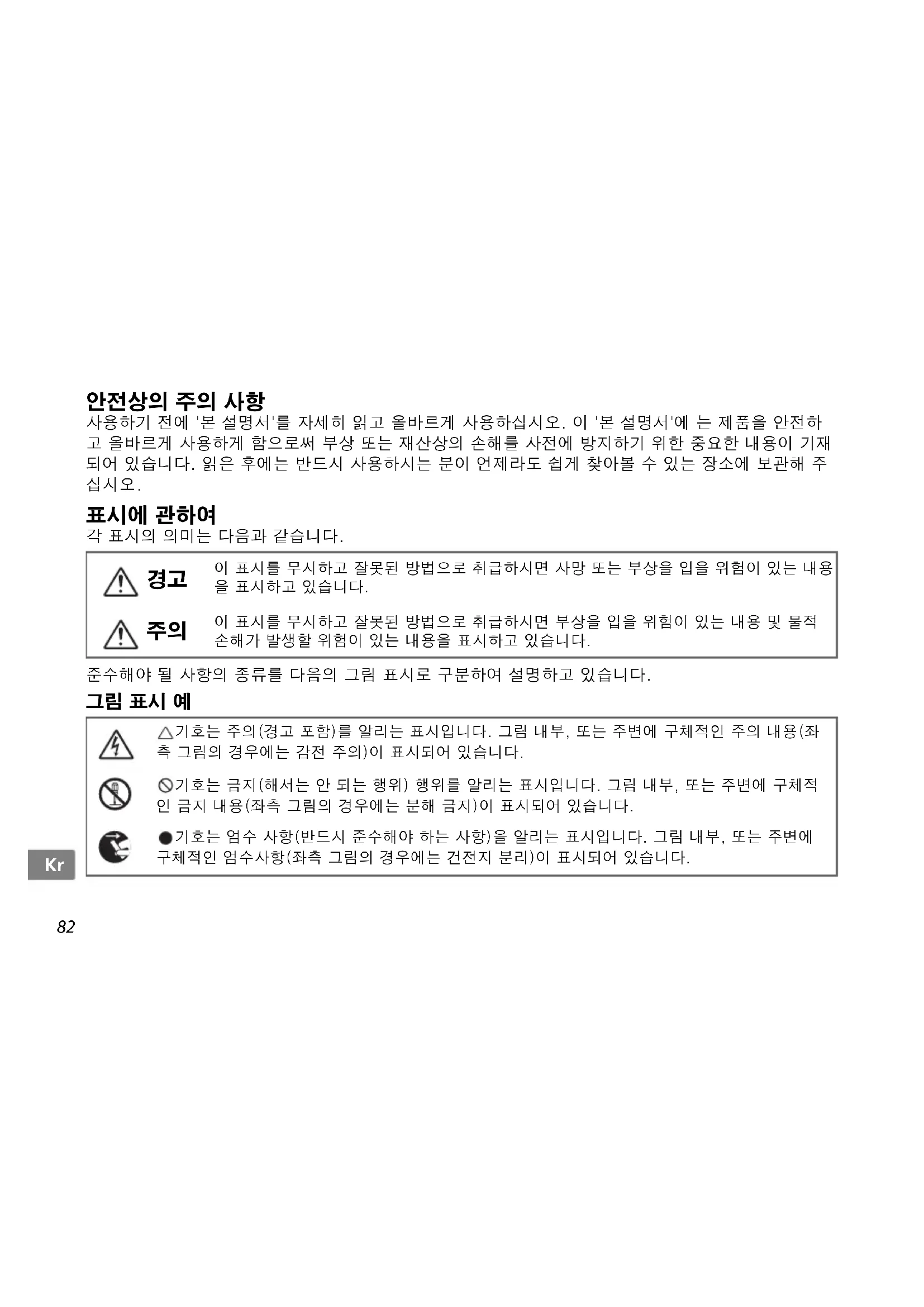 이 표시를 무시하고 잘못된 방법으로 취급하시면 부상을 입을 위험이 있는 내용 및 물적 손해가 발생할 위험이 있는 내용을 표시하고 있습니다. 기호는 주의(경고 포함)를 알리는 표시입니다. 그림 내부, 또는 주변에 구체적인 주의 내용(좌 측 그림의 경우에는 감전 주의)이 표시되어 있습니다. 기호는 금지(해서는 안 되는 행위) 행위를 알리는 표시입니다. 그림 내부, 또는 주변에 구체적 인 금지 내용(좌측 그림의 경우에는 분해 금지)이 표시되어 있습니다. 기호는 엄수 사항(반드시 준수해야 하는 사항)을 알리는 표시입니다. 그림 내부, 또는 주변에 구체적인 엄수사항(좌측 그림의 경우에는 건전지 분리)이 표시되어 있습니다.83