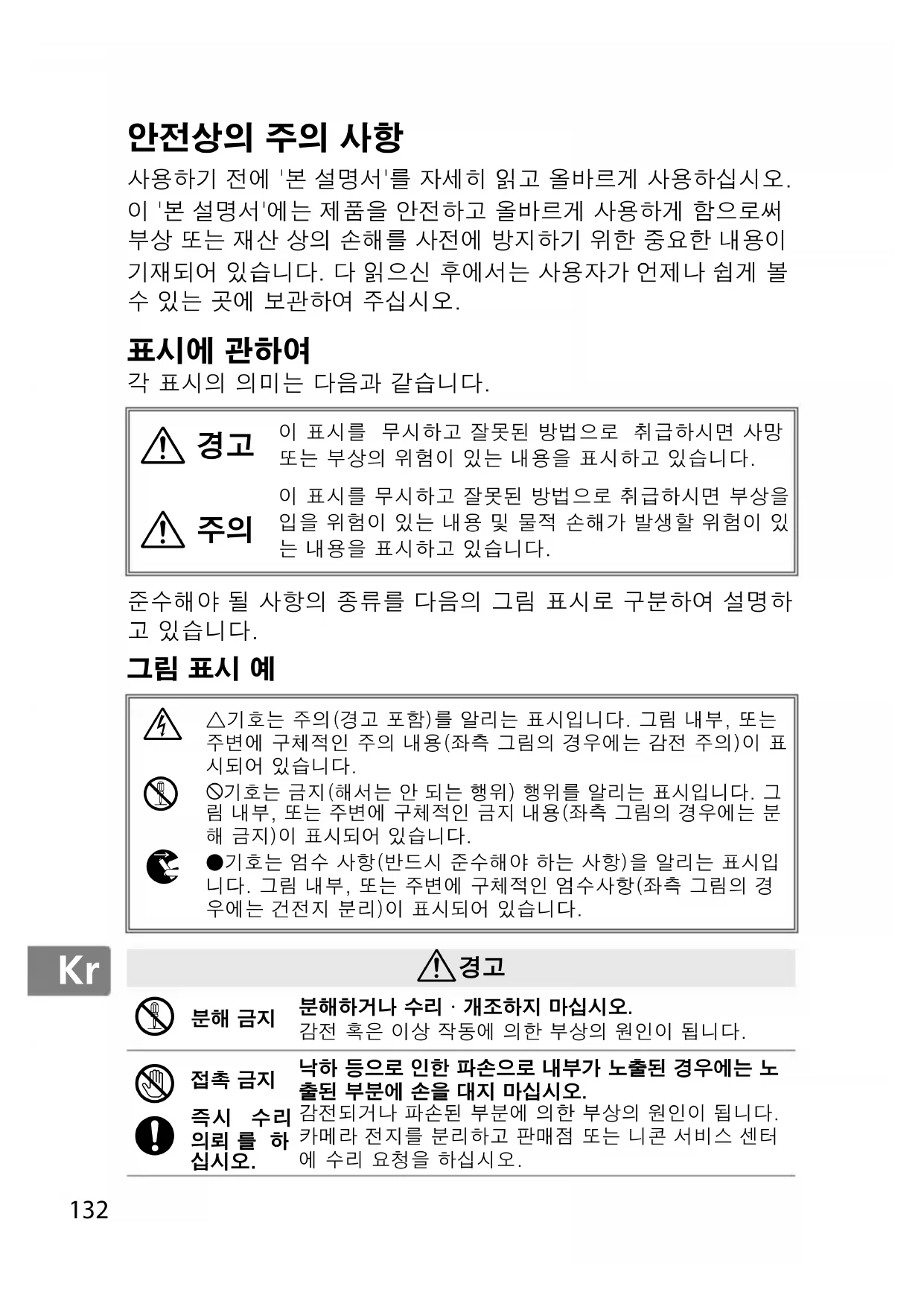 접촉 금지즉시 수리의뢰 를 하 낙하 등으로 인한 파손으로 내부가 노출된 경우에는 노출된 부분에 손을 대지 마십시오.감전되거나 파손된 부분에 의한 부상의 원인이 됩니다.카메라 전지를 분리하고 판매점 또는 니콘 서비스 센터에 수리 요청을 하십시오.