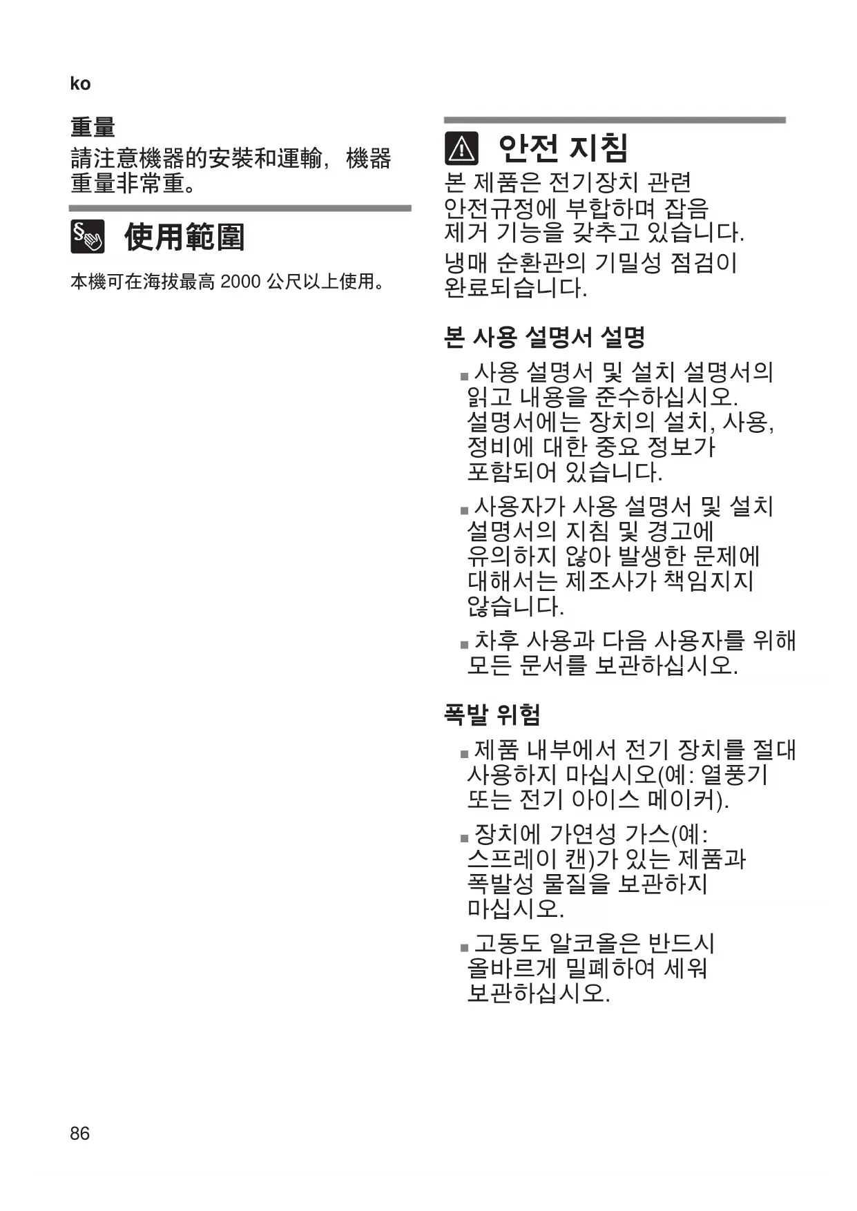 이 장치는 최대 해발 2000미터의 높이에서 사용하도록 규정되어 있습니다.