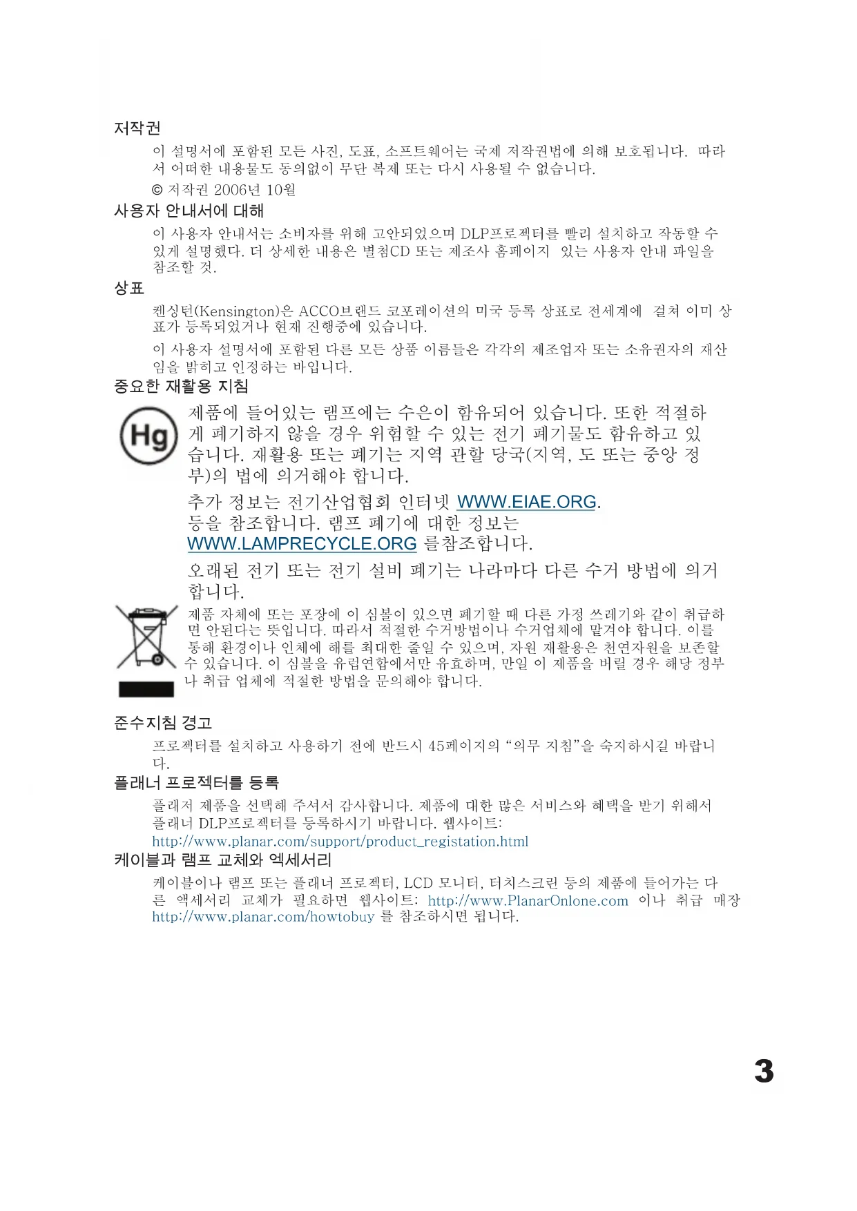 플래너 프로젝터를 등록 플래저 제품을 선택해 주셔서 감사합니다. 제품에 대한 많은 서비스와 혜택을 받기 위해서 플래너 DLP프로젝터를 등록하시기 바랍니다. 웹사이트: http://www.planar.com/support/product_registation.html 케이블과 램프 교체와 엑세서리 케이블이나 램프 또는 플래너 프로젝터, LCD 모니터, 터치스크린 등의 제품에 들어가는 다 른 액세서리 교체가 필요하면 웹사이트: http://www.PlanarOnlone.com 이나 취급 매장 http://www.planar.com/howtobuy 를 참조하시면 됩니다.4