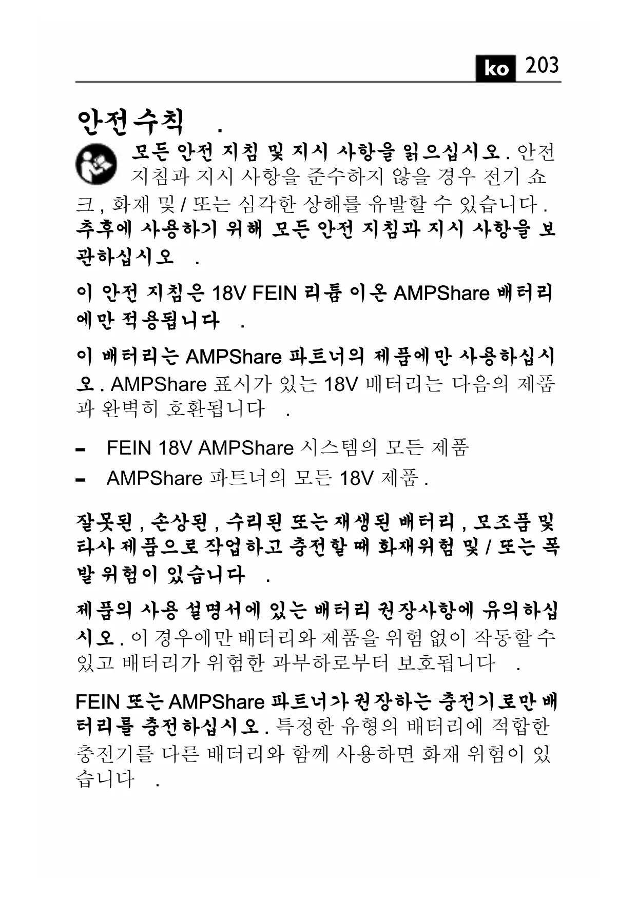 과 완벽히 호환됩니다 . – FEIN 18V AMPShare 시스템의 모든 제품 – AMPShare 파트너의 모든 18V 제품 . 잘못된 , 손상된 , 수리된 또는 재생된 배터리 , 모조품 및 타사 제품으로 작업하고 충전할 때 화재위험 및 / 또는 폭 발 위험이 있습니다 . 제품의 사용 설명서에 있는 배터리 권장사항에 유의하십 시오 . 이 경우에만 배터리와 제품을 위험 없이 작동할 수 있고 배터리가 위험한 과부하로부터 보호됩니다 . FEIN 또는 AMPShare 파트너가 권장하는 충전기로만 배 터리를 충전하십시오 . 특정한 유형의 배터리에 적합한 충전기를 다른 배터리와 함께 사용하면 화재 위험이 있 습니다 .204